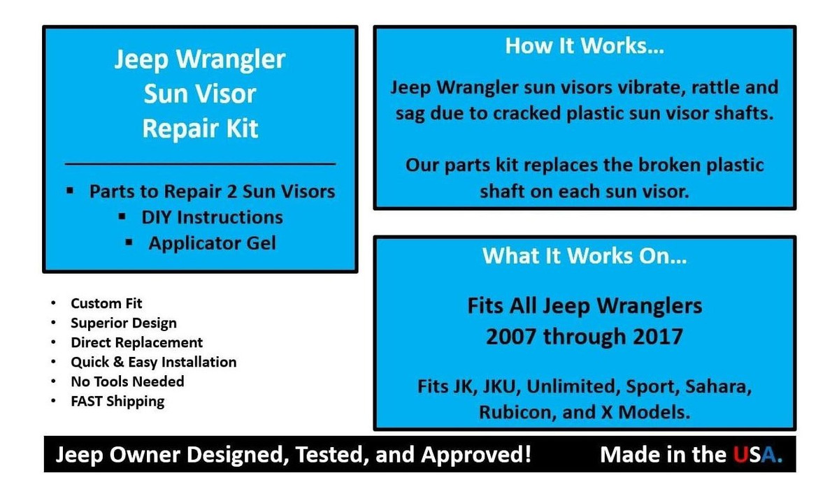 Kit de reparación de visera solar para Jeep Wrangler JK JKU modelos 2007 a 2017; Fabricado en Estados Unidos; 1 kit de reparación de 2 parasoles; Instalación rápida en 5 minutos, no necesita herramientas; Diseñado por el propietario de Wrangler, probado y aprobado para uso extremo Sonajero de visera solar Vibración molesta Visera solar caída Visera solar caída Tenemos la solución. Lo entendemos. Nuestro Wrangler tuvo el mismo problema. Esta solución solucionó el molesto problema de vibración y detuvo la flacidez. Proceso de instalación rápida, ajuste y apariencia personalizados, diseño superior y duradero, reemplazo directo que garantiza un ajuste adecuado, sin herramientas, sin pegamento, sin empalmes, sin cinta, el paquete incluye: 2 piezas de cilindro de plástico, gel aplicador e instrucciones de instalación (idioma español no garantizado). Diseñado para adaptarse a los modelos Jeep Wrangler. 2007 2008 2009 2010 2010 2010 1 201 2 2013 2014 2015 2016 2017 Todos nuestros productos estan en inglés SKU 4022203163