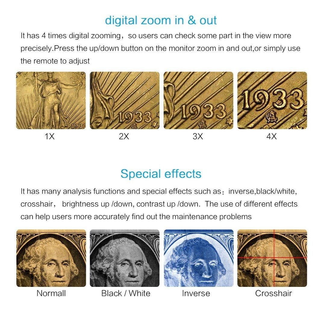 Enfoque controladores en ambos lados de la pantalla, conveniente tanto para operación de la mano izquierda y la derecha; La alta calidad del soporte del metal ajustable en altura. Puede ajustar la ampliación y la distancia entre la cámara y el objeto por el controlador remoto; Equipado con dos luces de relleno en ambos lados que se puede ajustar libremente, y el brillo puede ser ajustado por el regulador de intensidad; Soporte 4 diferentes métodos de salida: AV, USB, HDMI y tarjetas de memoria (hasta 32G); El mando inalámbrico a distancia y los botones en el monitor tanto le permiten tomar fotografías, grabar videos, acercar, alejar, y otras operaciones simples Nota: