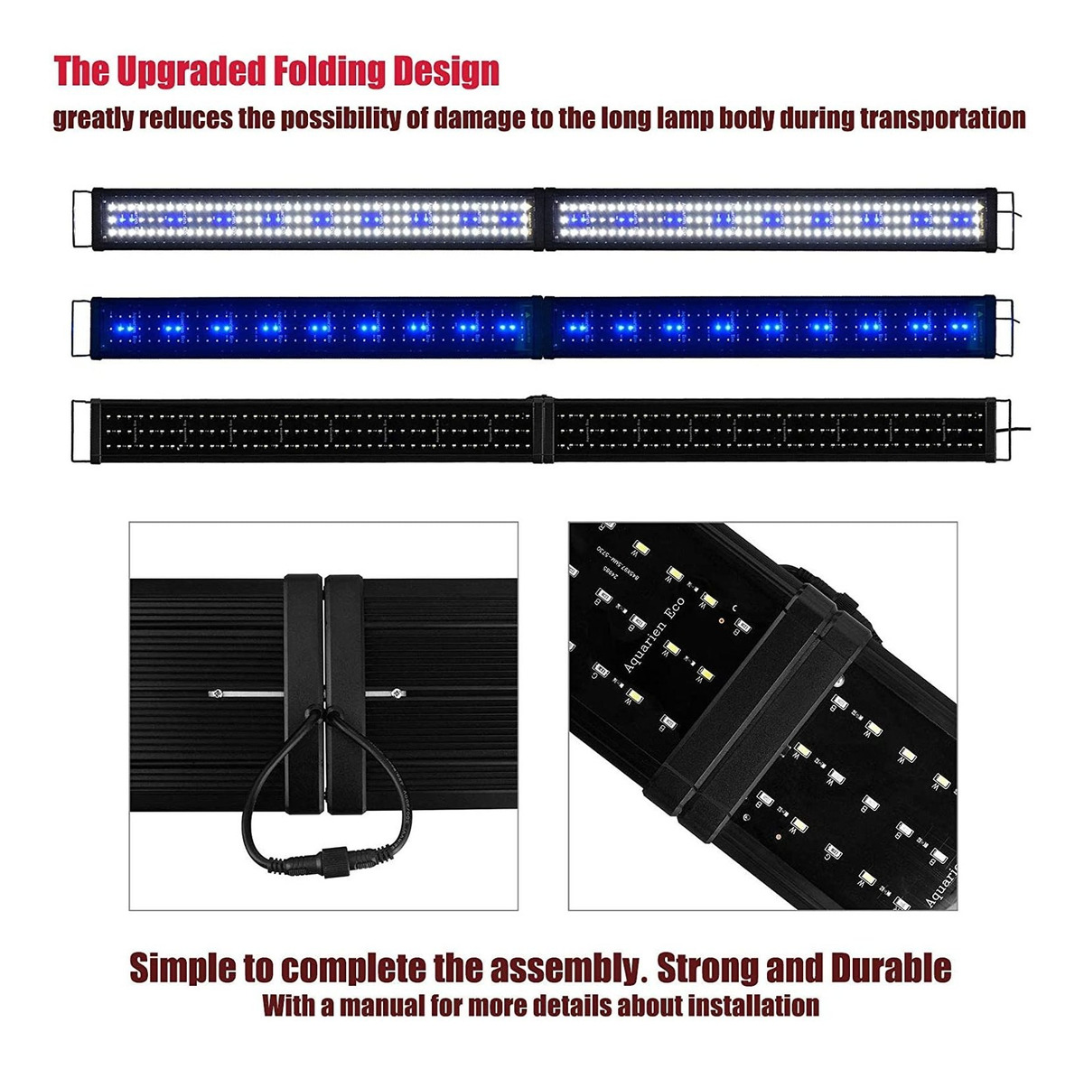 Two mode for Daylight and night light. Suitable for freshwater and marine tank. 5730 SMD White and Blue LEDs provide amazing shimmer.; Suitable Tank Length: 72inch/ 180cm – 78inch/ 200cm. With extendable bracket to fits your tank.; High-quality LEDs for low energy dissipation. Aluminum case for faster cooling to keep long service life. Lumen: 5124. Power: 33-34W.; This light is not waterproof, please dont put it into the water.; Package include: 1x LED Aquarium Light, 2x Extendable Brackets, 1 x Power Supply. We will check the packaging carefully before shipping, avoid the damage to the light during transit. Todos nuestros productos estan en inglés SKU 10032227353