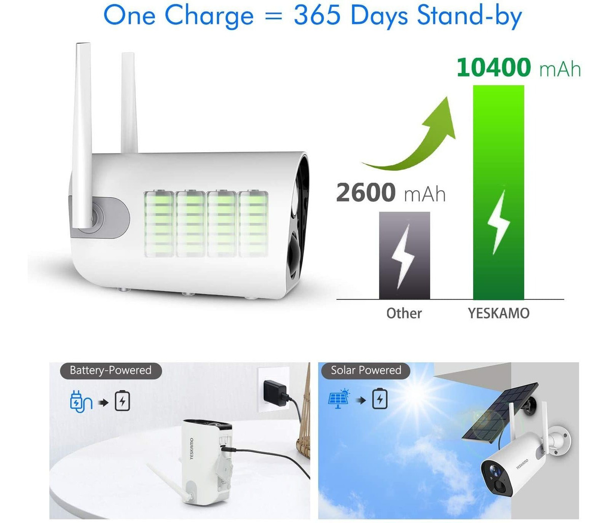 1080P Full HD de Seguridad; Con pilas de cámara inalámbrica y soporte del panel solar: cámara de seguridad exterior Wireless ha incorporado 4x10400mA Panasonic baterías recargables que duran hasta 10 meses de muy largo tiempo de espera. Alta capacidad pero de bajo consumo de energía hace que esta cámara inalámbrica de vigilancia se extiende más largo período de trabajo. de carga USB conveniente permite llevarlo a todas partes. Este alambre al aire libre de la cámara de recorrido libre 24/7, 365 días con el panel solar (no incluido) para suministro de energía sin parar, se asegura de vigilancia de la seguridad de todo el día 100% .; Instalación de dos vías de llamadas y sin complicaciones: Con una función de cancelación de ruido del micrófono y el altavoz, batería de la cámara al aire libre tiene una interacción fácil de usar que se puede ver, oír y hablar con su coche, bebé, animal doméstico o familiar con claridad. doble banda 4DB antena wifi, dos veces la velocidad de conexión que otras cámaras IP, soporta 2.4G WIFI (no 5G) y tiene fuerte señal wifi y estable, sentirse libre para instalar cámaras de seguridad alrededor de su casa o ponerlo sobre la mesa, sin cuerda o alambre necesario, 100% libre de alambre .; 1080P Full HD de seguridad para el hogar y la cámara de visión nocturna mejorada: Built-in 1/3” CMOS sensor de lograr la solución 1080P / 25fps, cámara de seguridad con energía solar tiene 2,0 megapíxeles lente que ofrece más claras y nítidas imágenes y vídeo, tanto de día como de noche. 100 ° ángulo de visión amplio disminuir considerablemente zona ciega, la familia y la propiedad de protección en múltiples ángulos. Puede 4x ampliar el vídeo vigilancia de su casa para ver detallada. 6 poderosa LED infrarrojo asegura ultra clara visión nocturna de hasta 66 pies, nunca salió de su casa de seguridad en la oscuridad .; Inteligente PIR detección de movimiento y notificación en tiempo real: La batería de la cámara wifi alimentado aplica tecnología avanzada de sensor de movimiento PIR, sólo se envía un mensaje de alarma al detectar señal de calor único, reduce en gran medida las falsas alarmas. Un evento desencadenado se almacena automáticamente en CloudEdge. Esta cámara IP de seguridad admite tarjeta micro SD (hasta 128 GB) y almacenamiento en la nube, grabaciones de vídeo codificado estrictamente por el sistema de cámaras de vigilancia, así protege su información y privacidad de los datos frente a .; Sólido IP65 resistente al agua y sin preocupaciones 12 meses: Elaborado a partir de vanguardia ASA material de fundición compuesta, esta cámara de seguridad WiFi es resistente al agua IP65 certificada para soportar condiciones meteorológicas adversas para la seguridad durante todo el año, funciona perfectamente en la lluvia, la congelación -4 ° F (- 20 ° C) inviernos, o abrasador 122 ° F (50 ° C) Summers. Nuestros soportes de cámaras de seguridad del hogar activación remota, fácil acceso y participación en vídeo a través de Cloudedge (iOS o Android) Cada compra incluye una garantía de por vida y soporte completo de 48 meses técnica. Todos nuestros productos estan en inglés SKU 21052002421