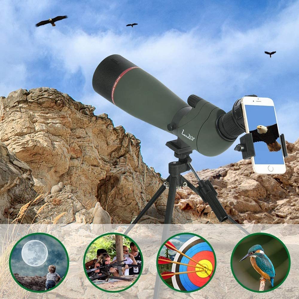Landove 20-60×80 Telescopio Terrestre telescopio viene con 20 a 60x de zoom ocular; útil para escanear a través de un área grande a 20x y luego hacer zoom con un mayor aumento en elemento de interés combinación perfecta con trípode y un adaptador universal del teléfono adecuado para la imagen videoclips de aves al aire libre; animales; la vida silvestre en grandes distancias; almacenar digitalmente las imágenes; clips de vídeo puntos principales: 20x variable de 60 aumentos y 80 mm lente del objetivo de la lente dinámica y la óptica totalmente recubiertos de múltiples ofrece un brillo y una claridad asombrosa para una óptima visualización Bak4 prisma de transmisión brillantes imágenes ricas en contraste a lo largo de toda la prueba de golpes a prueba de agua ya prueba de empañamiento rango de zoom de la construcción; ideal para todo tipo de condiciones climáticas diseño sellado duradero; marco de metal sólido y forrado de goma viene con un adaptador universal de teléfono inteligente viene con una gran rueda de enfoque y la tableta de metal trípode ideal para el rodaje; caza; observación de aves; cámping; viaje; excursionismo; manchas en la zona de destino o de otras actividades al aire libre Especificación: Ampliación: 20x -60x lente Objetivo diámetro: diámetro de 80 mm del ocular: 20 mm Prism: BAK4 FO V ángulo (): 1. 58 – 0. 91 FO V (ft / 1000yds ): 82. 9 pies – 48 pies FO V (m / 1000m): 27. 6m – 16m pupila de salida: 3. 3 mm 20X, 1. 22 mm 60X OJO relieve (mm): 17. 9 mm-15 mm CERCA FOCUS (m) : 6m resistente al agua: SÍ óptico Recubrimiento: Multi Coated completa nitrógeno llenó Usted recibirá: 1 x 1 x Telescopio digiscoping adaptador de trípode 1 x 1 x 2 x Bolsa de Carring tapa del objetivo 1 x Manual de instrucciones Todos nuestros productos estan en inglés SKU 4022163708