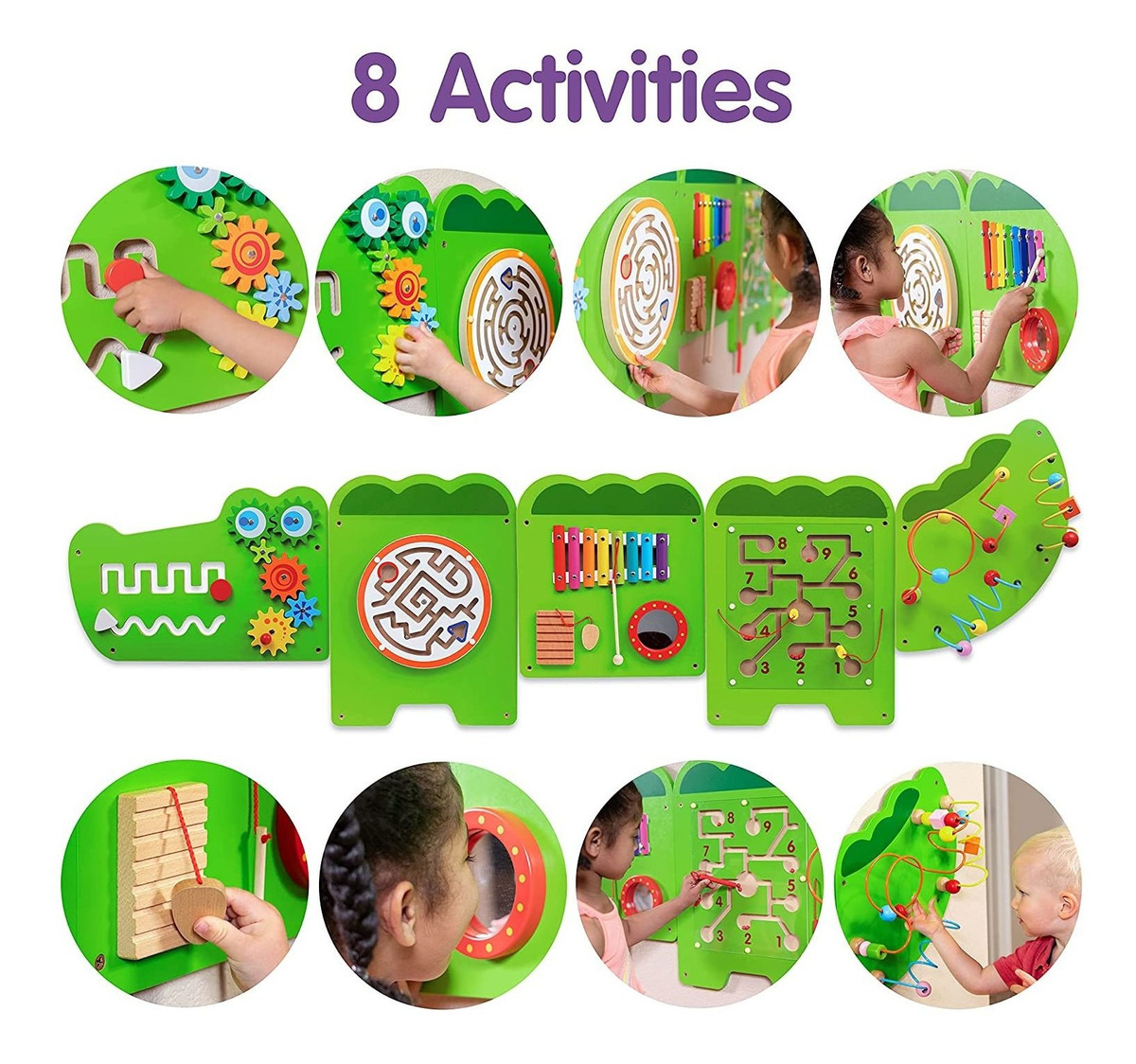 Convierte las paredes en terrenos de juego: esta tabla multisensorial contiene 8 actividades diferentes. Los 5 paneles cuentan con instrumentos de percusión, laberintos, piezas giratorias, clavijas entrelazadas y más; A partir de 59.1 ft: totalmente probado con los más altos estándares de consumo, este juguete de pared sensorial Montessori se puede montar a la altura adecuada para los pequeños aprendices.; Duradero y fácil de montar: los 5 paneles incluyen agujeros de fijación y tornillos de fijación para un montaje fácil y resistente. Y las actividades son duraderas y diseñadas para durar años sin romperse.; Explora los juguetes de Montessori: esta tabla de Montessori permite a los niños seguir su curiosidad. Mira cómo construyen habilidades motoras, coordinación, lenguaje descriptivo, forma, espacio y habilidades de razonamiento.; Mantén a los pequeños ocupados: utiliza estas actividades Montessori para mantener a tus hijos o nietos ocupados sin usar pantallas; Perfecto para grupos pequeños: con 6 pies y 2 pulgadas de largo, este panel de pared es perfecto para que los pequeños grupos de niños jueguen juntos y socializen; Decoración de pared adorable e interactiva: quieres decorar el dormitorio de tu bebé o la zona de juegos. Este bonito centro de actividades de cocodrilo añadirá una característica divertida a cualquier habitación sin ocupar espacio en el suelo.; Mezcla y combina paneles: nuestros paneles se ven muy bien por sí mismos y con amigos. Añade nuestro avión (Amazon No.B07XPRCT86), oso (Amazon No. B0892TXYZC), caballo (Amazon No. B07XGNJHC4) o más El panel de pared de actividad de cocodrilo cuenta con 8 actividades diferentes para desarrollar habilidades motoras finas, coordinación ojo-mano y lenguaje descriptivo. Esta tabla ocupada para niños pequeños está probada con los más altos estándares de consumo. Los 5 paneles incluyen agujeros de fijación y tornillos de fijación para un fácil montaje. Monta la altura adecuada para los estudiantes pequeños! Decora dormitorios, aulas, salas de espera o zonas de juego sin ocupar espacio en el suelo. Dale a los niños un lugar para pagar juntos y socializar. Incluye: instrumentos de percusión, espejo, bolígrafo magnético y bolas, laberintos, actividades de enhebrado, piezas de rotación y clavijas entrelazadas. || Tamaño de los paneles montados: 6.2 ft de largo. Altura de 24.0 in. Todos nuestros productos estan en inglés SKU 91221035020