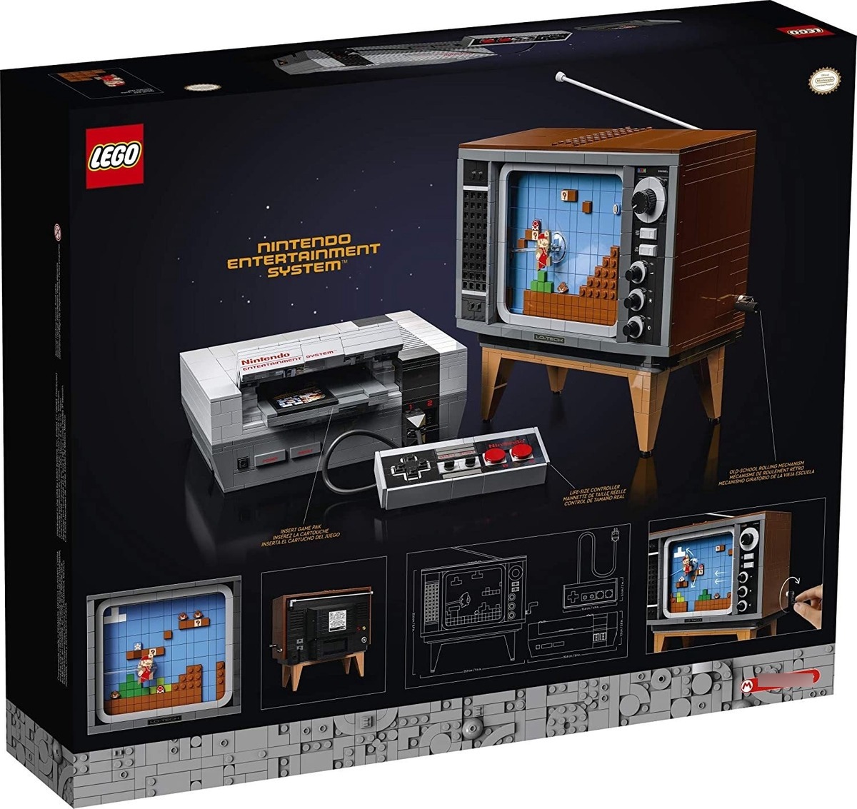 recuerdos nostálgicos de activación a medida que construye este ladrillo Sistema maravillosamente detallado LEGO Nintendo Entertainment (71374) e interactiva, televisión de estilo de 1980 que muestra el clásico juego de Super Mario Bros.; La televisión tiene una pantalla de desplazamiento mango que funciona y si escanea el ladrillo acción mediante la colocación de LEGO Mario (figura no incluido) en la ranura en la parte superior, que va a reaccionar a los enemigos en pantalla el, obstáculos y potenciadores; Los detalles auténticos de la consola NES son recreados en estilo LEGO, incluyendo un controlador y una ranura de apertura para el cartucho de juego armable con una función de bloqueo realista delicias de los fans de Super Mario Bros.; Si usted fuera un jugador de vuelta en el día de NES, un ventilador de cosas retro, o simplemente en busca de una inmersión, diversión, proyecto creativo de bricolaje para dejar una sensación de revitalización, este kit de construcción de modelos 2646 pieza es ideal para usted; Las medidas de televisión edificables más de 8 de altura (22,5 cm), 9 (23,5 cm) de ancho y 6 (16 cm) de profundidad, y junto con el modelo NES hace que un elemento de la pantalla fresca para su hogar u oficina. También hace que el mejor regalo para los amigos del videojugador LEGO Estilo: Embalaje libre de la frustración