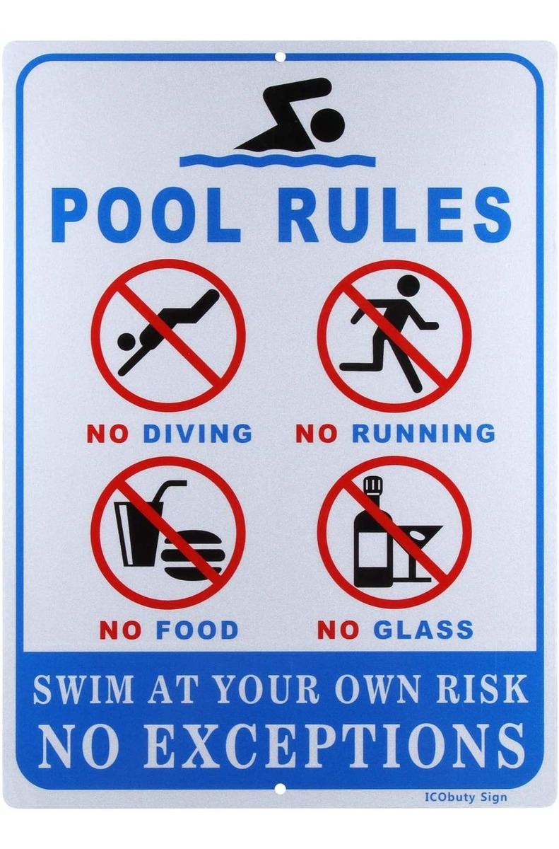 Letrero de aluminio con reglas de piscina, 10.0 x 14.0 in, perfectamente diseñado e impreso, apto para interiores o exteriores; Se ha producido un efecto reflectante en la superficie de la señal, se ha obtenido una mayor visibilidad nocturna de la señal reflectante.; Este cartel está fabricado con aluminio libre de óxido.; Esquinas redondeadas con orificios de montaje de 1/8 para una fácil instalación.; Larga duración, los gráficos y los textos no se desvanecen. Tipo de material:Pool Rules