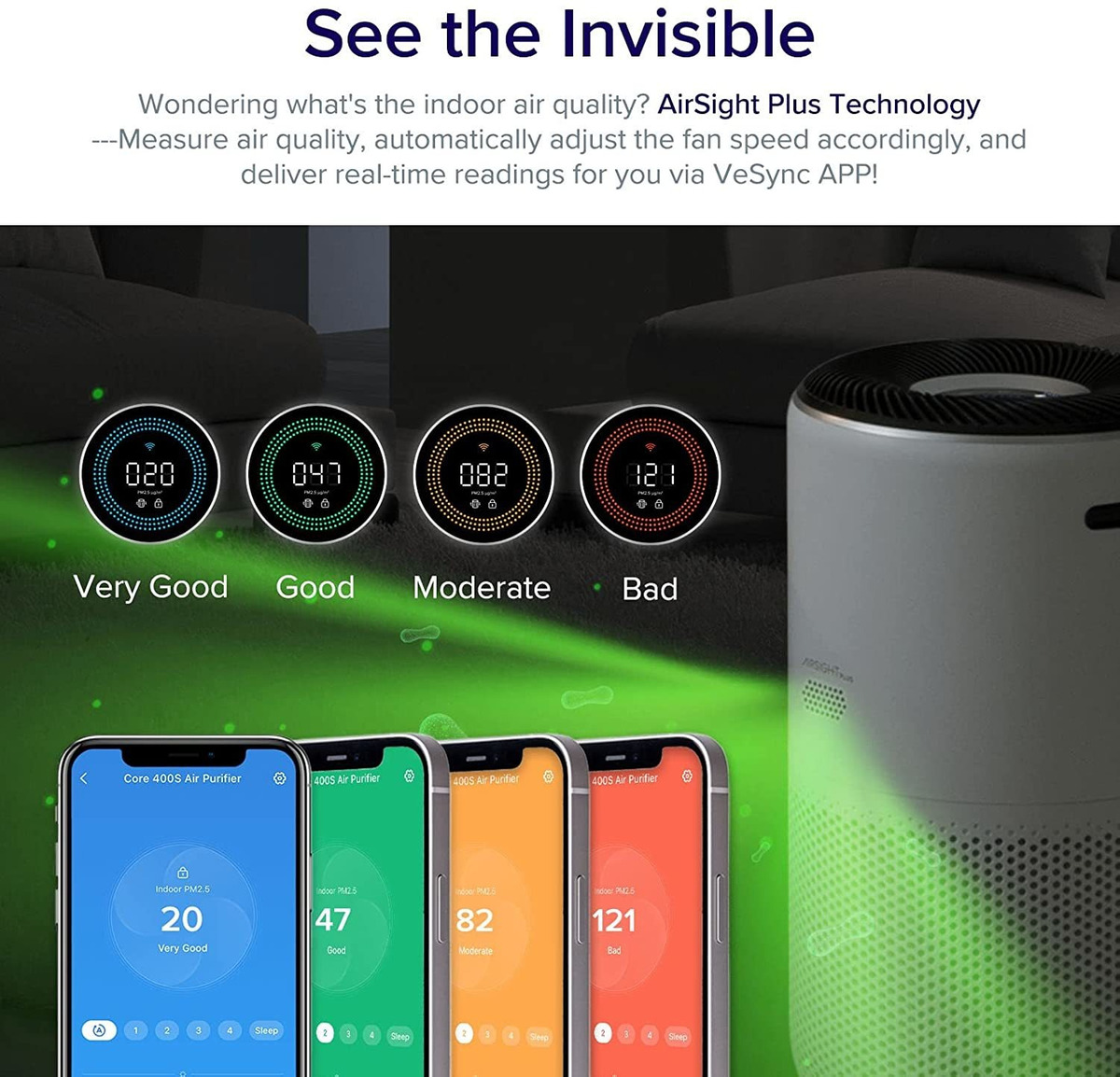 Detecta y reacciona automáticamente a los cambios en la calidad del aire. A continuación, informa de la contaminación en tiempo real en la pantalla LCD y en tu aplicación gratuita VeSync Link.