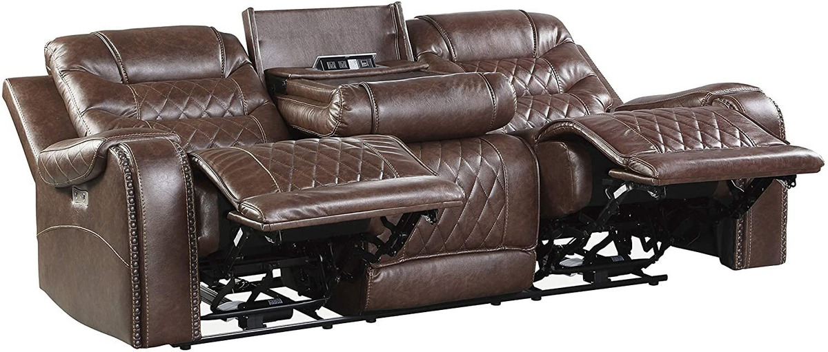 95% poliéster 5% poliuretano; Un (1) sofá reclinable de color marrón; Tapicería de microfibra pulida; Asiento reclinable y puerto USB en dos extremos; Bandeja central desplegable con estación de carga y portavasos; Se envía en una (1) caja y requiere montaje; Componentes incluidos: respaldo central Color:Marrón | Estilo:Sofá (Potencia)