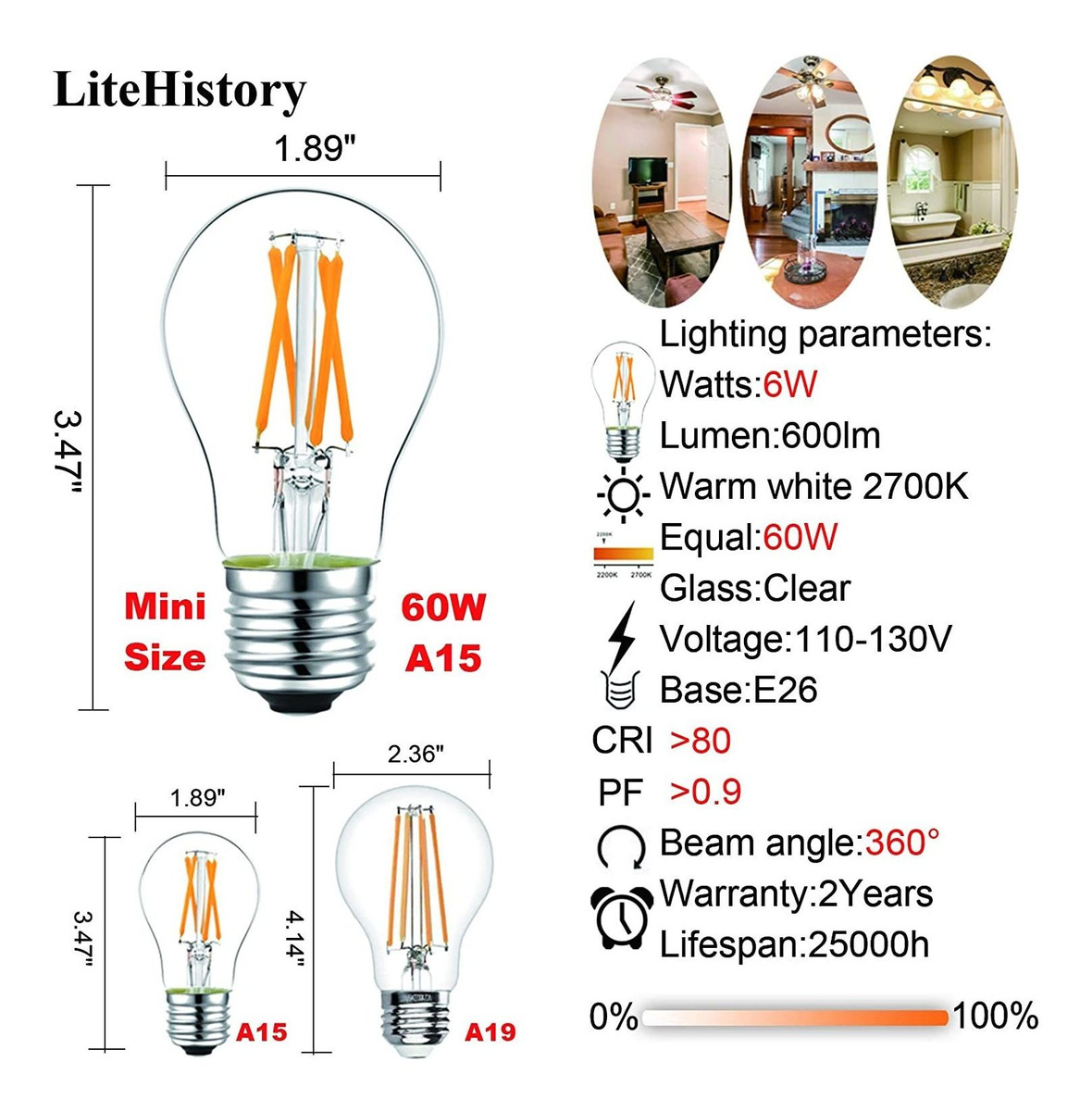 Especificaciones: Litehistory Bombilla Led E26 Regulable 6 W Igual 60 W Led Vi