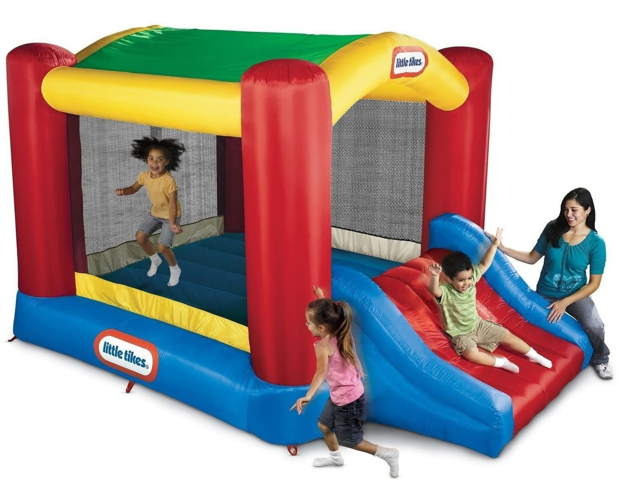 Grande, 7-foot arena acolchada para silla mecedora, diversión, y diapositiva de la salida; Toldo de arco proporciona constante); Tres diapositivas malla proteger a los niños, y dejar que los padres ver la diversión; Anclaje de postes la Bouncer firmemente en su lugar, mientras que un soplador de alta resistencia proporciona un flujo de aire continuo; Construido de material y resistente a los pinchazos The Little Tikes Shady Jump n Slide bouncer is a backyard inflatable with an arching shade canopy for bouncy fun in the sun! This inflatable bouncer features a slide and large bounce area covered by a protective canopy. Kids can play together and get great exercise in this timeless bounce house. The mesh sides help keep kids on the bouncing surface.