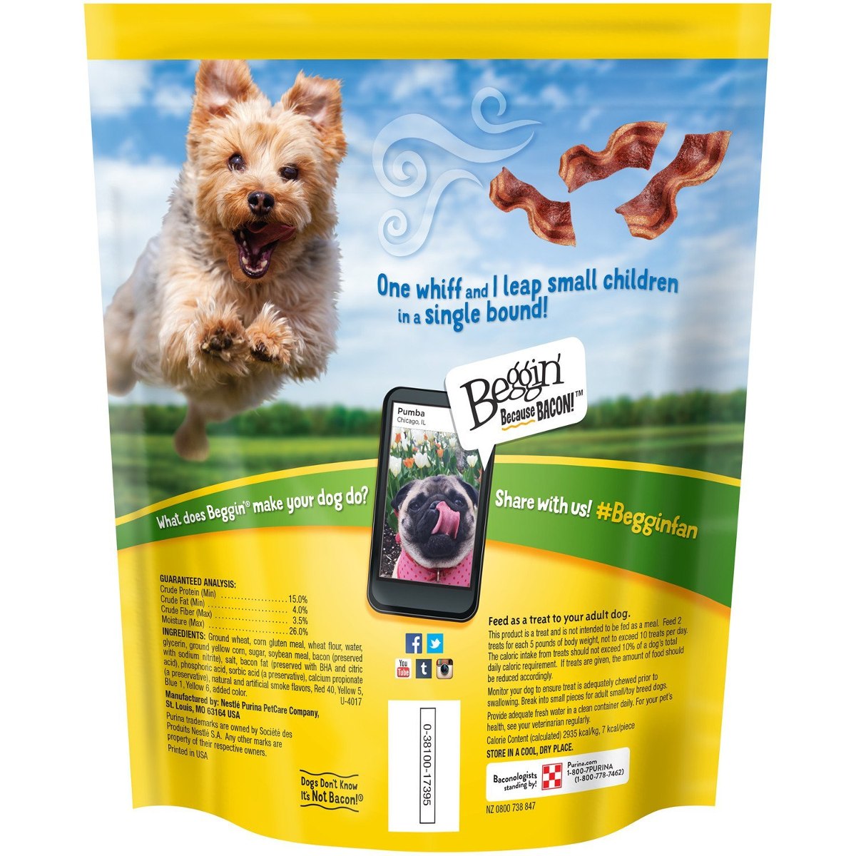 Este producto es una delicia y no está destinado a ser alimentado como una comida. Alimentación 2 golosinas para cada 5 libras de peso corporal al día, que no exceda 10 trata por día. La ingesta calórica de golosinas no debe superar el 10% del total requerimiento calórico diario de un perro. Si se dan golosinas, la cantidad de alimentos debe reducirse en consecuencia. Monitor de su perro para asegurarse de tratamiento se mastica adecuadamente antes de tragar. Proporcionar agua fresca adecuada en un recipiente limpio todos los días. Romper en trozos pequeños para perros de raza pequeña / juguete adulto. Para la salud de su mascota, consulte a su veterinario regularmente. Alimentar como un regalo a su perro adulto. Guardar en un lugar fresco y seco. Un (1) 25 oz Snacks para perros Purina Beggin’ sabor tocino – la bolsa; Hecho con bacon auténtico; Ofrece la sizzlin sabor, el aroma y el sabor de tocino que los perros anhelan; Ofrece 15% de proteína en cada bocado; Viene en un tamaño diseñado con perros pequeños en mente Adicional Filtrado Todos nuestros productos estan en inglés SKU 22091718223