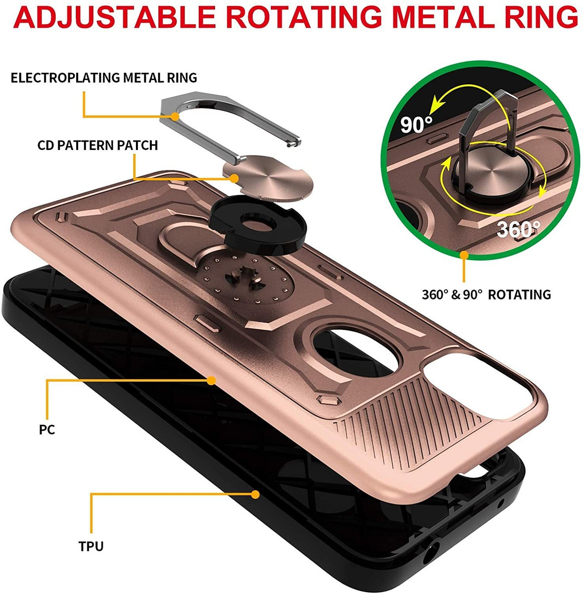 El soporte de anillo integrado resistente y duradero proporciona 2 ángulos de visión manos libres, visualización vertical y horizontal, también ayuda a evitar que tu teléfono móvil se caiga.