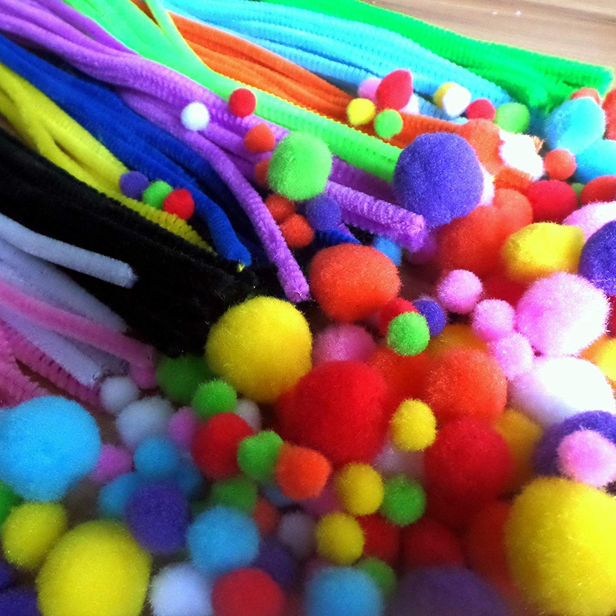 – Pompones: 250pcs, colores multi (0,39″ x 0,59″ 150pcs x40pcs +0.79″ x 30pcs + 1,2″ x 10 piezas)