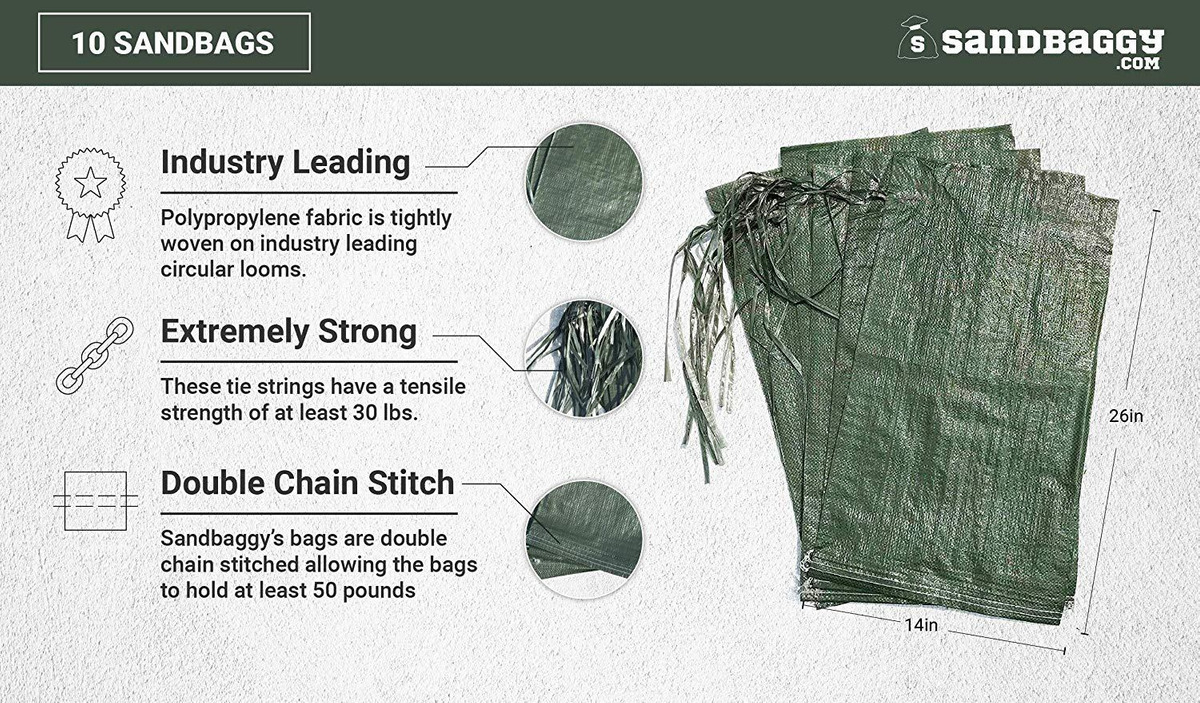 Grado militar: Con un parte inferior cosido doble y una capacidad de peso 50 lb, estos sacos de arena Sandbaggy son listo para ser llenado con grava o arena; PROTECCIÓN SOLAR: Hecho con un inhibidor de rayos UV que permite saco de arena a últimos de 1600 horas bajo la luz solar directa o 6 meses .; CADENA TIE-PRE ADJUNTA: lazos Sandbag será pre-fijado a la bolsa antes de llegar. Todo lo que necesita hacer es llenar las bolsas con grava o arena y cerrar la parte superior de la bolsa de arena con la cadena de lazo; sacos de arena color verde: permite el uso en obras de construcción, vertederos y protección contra inundaciones alrededor de las casas / edificios; Incluye 10 bolsas de arena vacías – llega en un embalaje libre de frustraciones (sin el embalaje al por menor) Todos nuestros productos estan en inglés SKU 27061920011