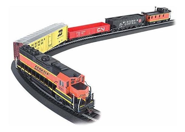 Completar listo para correr 130 piezas Juego de tren de mercancías; Accionado por una locomotora diesel de EMD GP40 con la linterna de funcionamiento; incluye; Abrir Quad tolva de coches, Góndola de coches, acero chaquetón de coches, off-set Cúpula furgón de cola, Puente de señal, Figuras miniatura, ferrocarril signos, señales de tráfico, y postes de teléfono; 47″ x 38″ Óvalo de Snap-Fit E-Z Pista, Power Pack y regulador de la velocidad; Escala HO 1:87 Descripción del producto