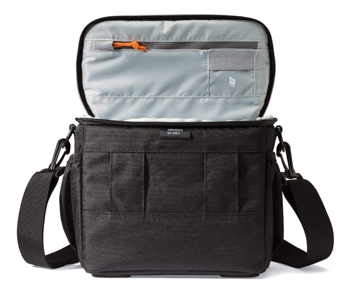 La Aventura SH 160 II se ajusta a una réflex digital con objetivo kit (como Canon Rebel T5i con 18-135 mm), lente adicional (como 28-300mm zoom) y el flash, tarjeta de memoria de repuesto y accesorios pequeños; A duraderos, salvaguardias de base moldeados se preparan de la humedad, la suciedad y el impacto; Un sistema divisor ajustable en el compartimento principal le permite personalizar su equipo; Cuenta con un bolsillo con cremallera de accesorios bajo faldilla protectora, integrado en el bolsillo de la tarjeta de memoria, y dos bolsillos laterales con pliegues; Detalles adicionales incluyen asa de agarre cómodo y correa desmontable / ajustable y acolchada hombro, y un incorporado el lazo de cinturón Estilo: Adventura SH 160 II