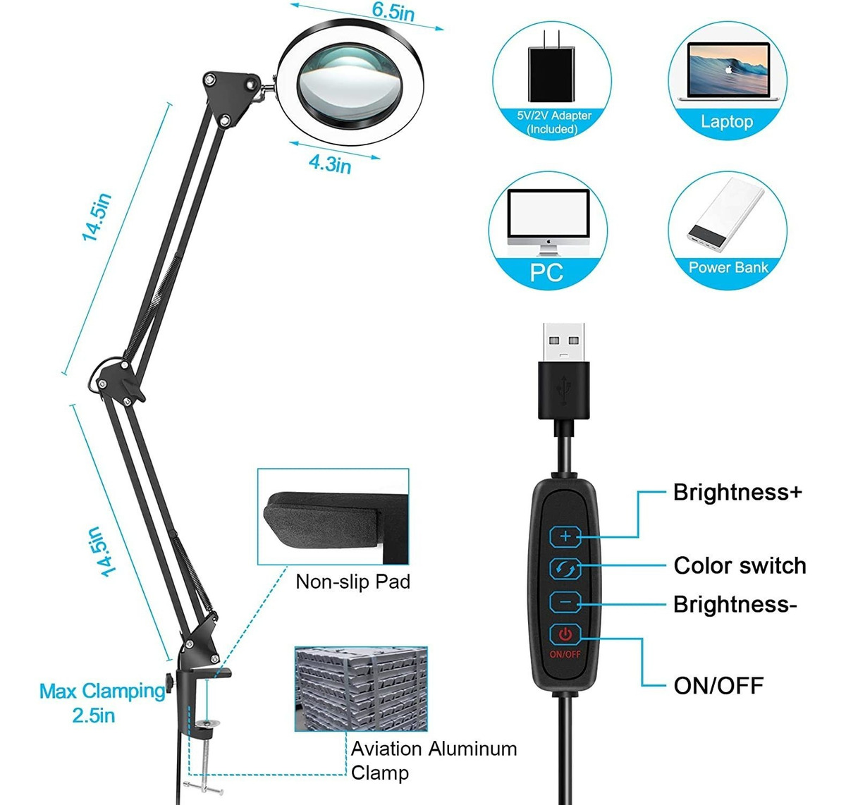 Lente de lupa de 5 x y 8 dioptríasLa lupa LED CUMKA con luz viene con una lente de vidrio real de 5 x y 8 dioptrías con un diámetro de 4.3 pulgadas, adecuada para trabajos de enfoque cercano. Nuestra lámpara de aumento puede ampliar pequeñas cosas sin distorsión óptica, como las densas palabras pequeñas en la botella de pastillas y el circuito complejo en la placa de circuito. No te sentirás incómodo si miras a través de la lente durante mucho tiempo, lo que es muy útil para los ojos de las personas mayores.; 3 modos de color y 10 niveles de brillo15 W, 1500 lúmenes y 72 chips LED superbrillantes que permiten que la lámpara de aumento CUMKA tenga 3 modos de color (cálido, blanco cálido, blanco frío) así como 10 niveles de brillo regulables continuos del 10% al 100%, que equivale a 30 modos. Simplemente enciende el controlador de forma cómoda y rápida para elegir tu modo de iluminación preferido entre las múltiples opciones, puedes satisfacer tus diferentes necesidades en diferentes entornos.; Abrazadera de metal fuerte y ampliamente utilizadaLa lámpara de lupa CUMKA tiene 3 pomos, 4 resortes y una abrazadera de metal que puede mantener la estabilidad del brazo oscilante. Ten en cuenta que solo tenemos abrazadera de metal negro en lugar de otros colores. La abrazadera nunca se romperá debido a la fuerte dureza del material metálico. Nuestro brazo es de 14.5 pulgadas cada uno, mucho más largo que el brazo de otras lámparas. La lupa CUMKA con luz es una opción perfecta para leer, coser, reparar, manicura, manualidades, abalorios, costura, etc.; Función de memoria y protección ocularLa lupa iluminada CUMKA tiene función de memoria, que nos distingue de otras marcas. Cuando vuelvas a encender, la lámpara recordará tu último modo de ajuste, por lo que no te molestará en configurarlo de nuevo. El cabezal de la lámpara adopta la tecnología luminosa más avanzada, brilla sin sombra o parpadeo y bloquea el 99.98% de la luz azul que es perjudicial para los ojos humanos. La luz uniforme ayuda a prevenir mareos y daños en los ojos.; Alimentación por USB y servicio de 12 mesesNuestras lupas tienen un puerto USB y puedes alimentar la lámpara a través de la laptop, escritorio, banco de energía, adaptador de 5 V/2 A (incluido), etc. Ofrecemos servicio al cliente de 12 meses. Si hay alguna pregunta, por favor póngase en contacto con nosotros vendedor y le ofreceremos una solución satisfactoria. Todos nuestros productos estan en inglés SKU 91221008070
