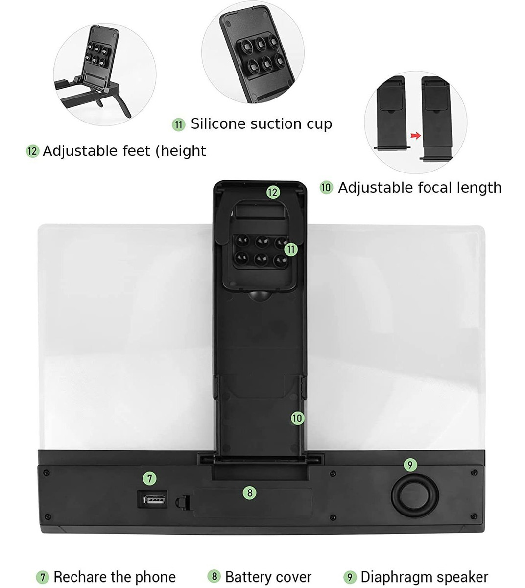 Altavoz Bluetooth de 14 pulgadas con lupa para teléfono móvil. Pantalla grande de 14 pulgadas. Adecuado para las personas que miran la pantalla pequeña del teléfono durante mucho tiempo. Si usted, sus familias, sus amigos a menudo utilizan teléfonos móviles pero odian mirar la pantalla pequeña, entonces definitivamente lo necesita; Altavoz Bluetooth integrado. El altavoz adopta la tecnología de diafragma y tiene un efecto de sonido estéreo. Por lo tanto, también se puede utilizar como un altavoz Bluetooth solo.; Longitud focal ajustable. Puedes estirar el soporte de teléfono para ajustar la longitud entre tu teléfono y la pantalla, lo que lo hace compatible con todos los tamaños de teléfono.; Nuestra lupa de pantalla para teléfono viene con un ángulo de visión ajustable. La base detrás de la pantalla te permite ajustar tu teléfono para obtener la mejor claridad visual.; Dos métodos de carga. Utiliza el cable de carga USB. Carga de la batería como un banco de energía de emergencia. Diseño con una ranura para batería, puedes instalar la batería para usar. (La batería no está incluida en el juego) Todos nuestros productos estan en inglés SKU 91221082140