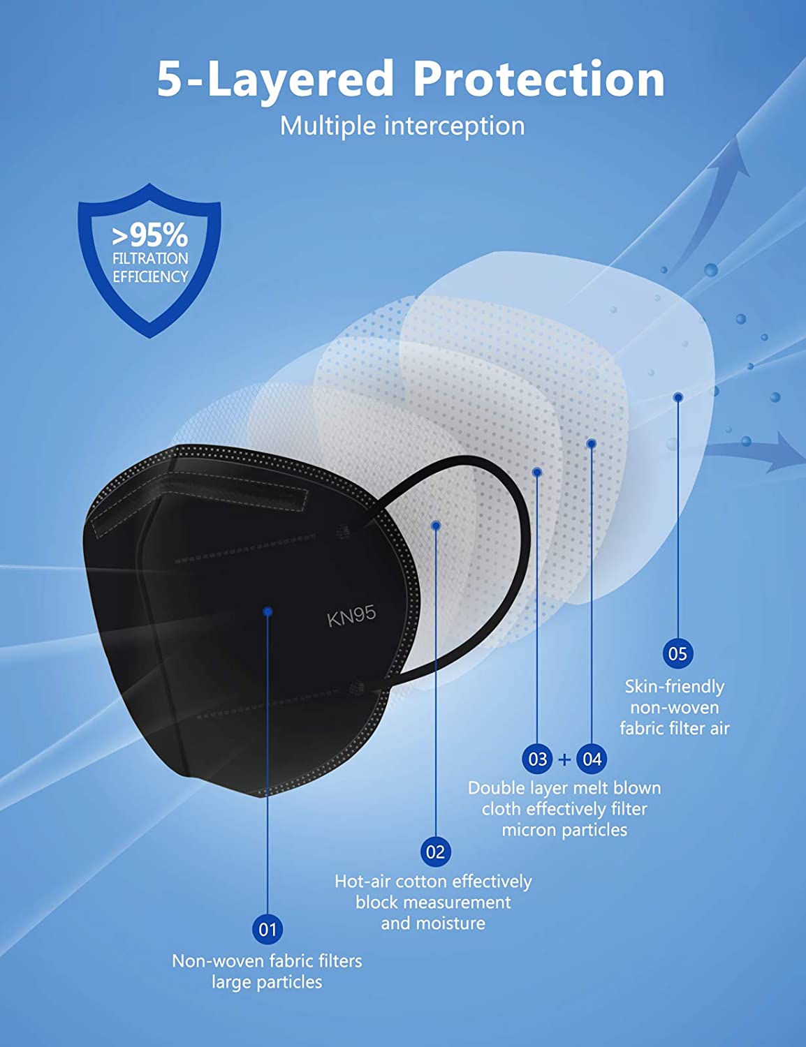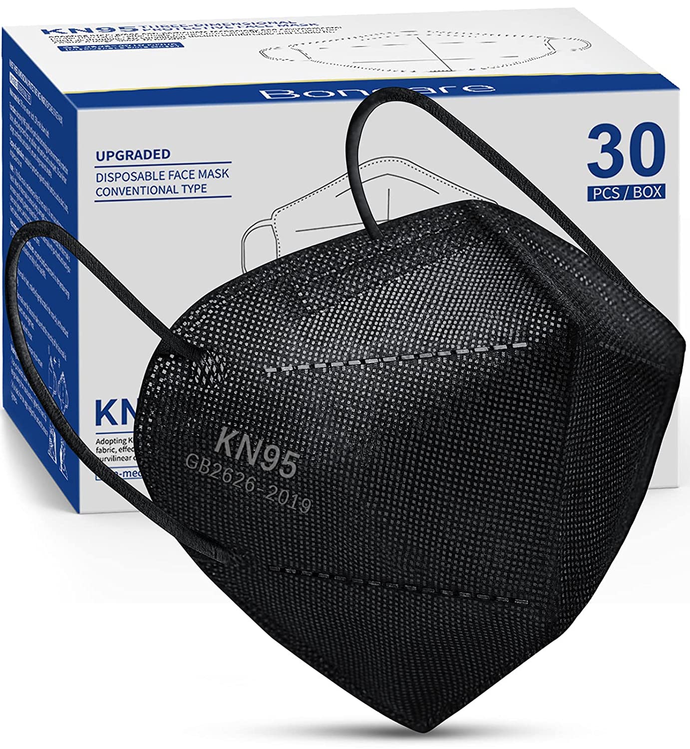 Especificaciones: Máscara facial Boncare KN95 30 piezas, máscara facial negra de 5 capas para hombres y mujeres Eficiencia del filtro = 95%, transpirable y cómoda