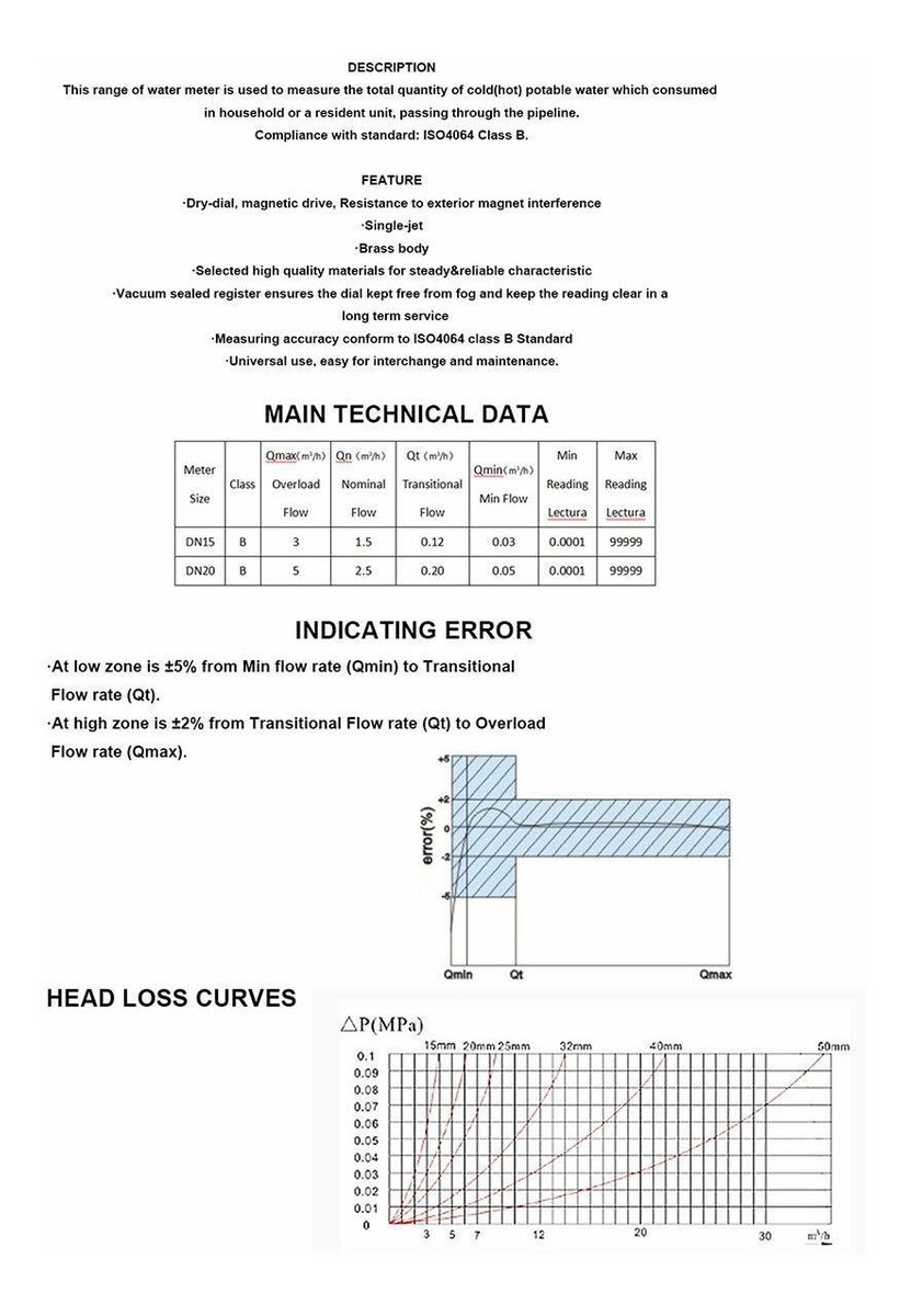 Adopta el cobre de alta calidad, estable y un rendimiento fiable. sistema de conteo adopta sellado al vacío, prevenir atomización condensación. rueda de la palabra y exhibición del indicador puede mantener lectura clara durante mucho tiempo, la lectura no está contaminada. Contador con función de rotación arbitraria, aportar comodidad a la lectura del medidor. Amplio rango de medición y el flujo de iniciación pequeña. Bella apariencia, tamaño pequeño.