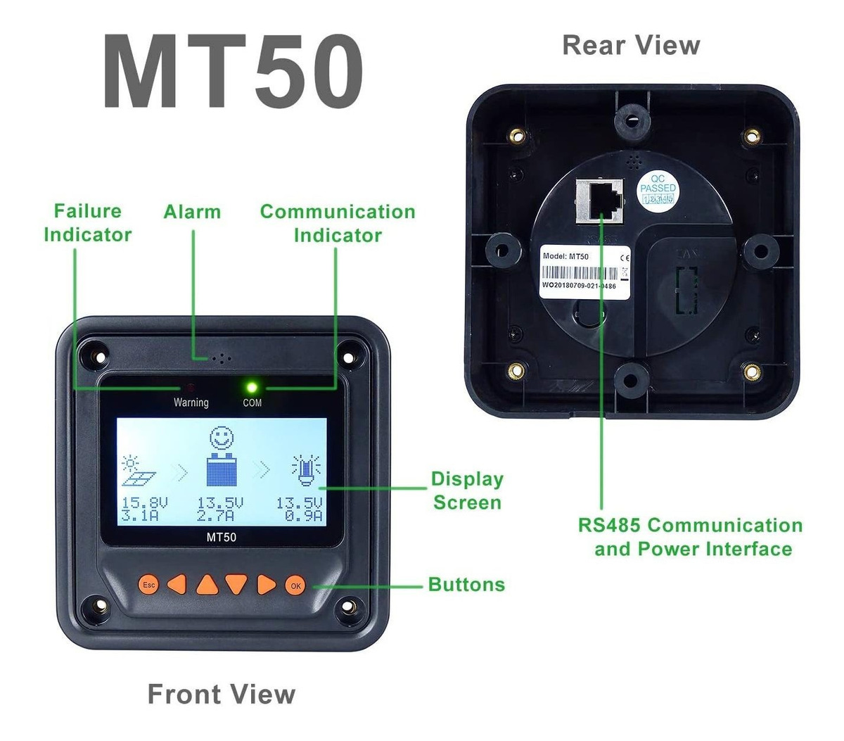1) Comprobación automática: alarma en tiempo real de información de fallo. Modos de control de carga diversificados: control manual, encendido y apagado de luz, temporizador de encendido, control de tiempo. – Selección de tipo de batería: gel, sellado, inundado y usuario (programable). – Parámetros programables.; 2) Funcionamiento sencillo y cómodo mediante un funcionamiento directo y rápido de seis teclas de función de navegación.; 3) Compatible con solo controladores EPEVER: Tracer-BN, Tracer-AN, Triron-N, XTRA, LS-B(P), VS-BN, eTracer, iTracer, Tracer-BPL. Ten en cuenta que este medidor remoto MT-50 no funciona con otros controladores de marca.; 4) Visualización clara: la pantalla LCD informativa muestra los datos operativos y el estado del sistema.; 5) Ahorra energía: la retroiluminación se apaga automáticamente después de 30 segundos. Tenemos un equipo profesional de posventa de Estados Unidos. Color:mt50