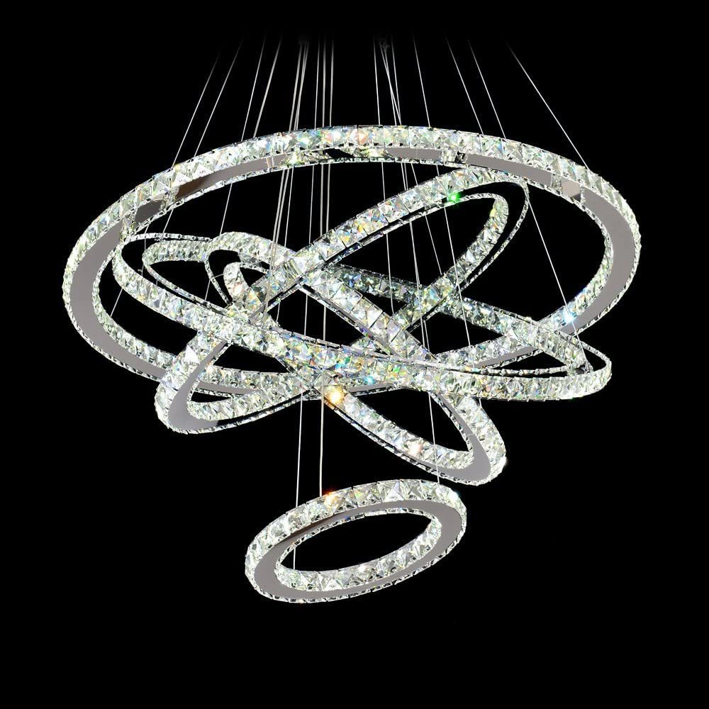 Modelo: lámpara de techo moderna de cristal con 5 anillas, color de la luz: blanco frío (6000 K-6500 K); material: cristales K9 de alta calidad y acero inoxidable; Diámetro del tamaño: 31.5 27.6 23.6 19.7 11.8 pulgadas, colgar máximo: altura ajustable de 11.8 a 118.1 pulgadas; grosor del cable de acero inoxidable ajustable de hasta 0.039 in; No regulable; bombilla incluida: LED integrado, máximo 106 W, voltaje 85-265 V, fuente de luz: 2835 LED; Espacio sugerido: comedor, sala de estar, dormitorio, habitación de las niñas, habitación de los niños, pasillo, porche, hotel, escalera, vestíbulo, oficina. Espacio sugerido: comedor, sala de estar, dormitorio, habitación de las niñas, pasillo, porche, hotel, escalera, vestíbulo, pasillo, oficina; Garantía de satisfacción: 36 meses en piezas. Servicio de atención al cliente 24/7 con asesoramiento técnico Todos nuestros productos estan en inglés SKU 91221006987