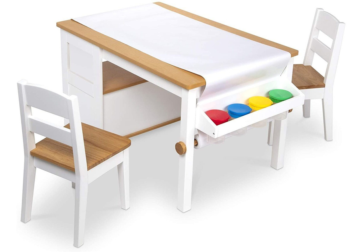 Mesa de arte de madera resistente de 2 tonos fácil de montar con estantes, 4 soportes para vasos de pintura integrados, dispensador de papel y 2 sillas de madera a juego, tamaño para niños; incluye rollo de papel de 75 pies de largo; Tablero de mesa acabado en madera natural; patas blancas. Acabado de madera natural en los asientos; patas y respaldos de color blanco brillante; Perfecto para proyectos de arte de todo tipo; los estantes de almacenamiento mantienen los suministros a mano y son ideales para una limpieza rápida; Montaje con solo un destornillador de cabeza Philips, no incluido (herramientas eléctricas no recomendadas); Para edades de 3 a 8 años Este es el lugar perfecto para que uno o dos niños levanten una silla y se pongan a crear. La resistente mesa de arte de madera con dos sillas a juego incluye estantes para almacenamiento, portavasos incorporados para pintura, un innovador soporte para rollo de papel y un rollo de papel de 75 pies de largo. Tire del papel sobre la mesa, pinta, coloree o dibuja, luego arríguelo cuando se completen las obras maestras. El acabado de dos tonos se adapta a cualquier decoración del hogar y se limpia para mantener un aspecto nítido y limpio (los asientos de mesa y silla son un acabado de madera natural clara; las patas de la mesa y la silla y los respaldos son de color blanco brillante). La mesa y las sillas son fáciles de montar con solo un destornillador Philips-head (no incluido), e increíblemente resistente una vez montado. Nuestras pruebas van más allá del estándar de la industria para garantizar la estabilidad de nuestros muebles de madera. Estas sillas recibieron una clasificación de peso de 100 libras, y tienen una altura de asiento de 11.25 pulgadas y diseño reforzado y resistente a las puntas; la altura de la mesa de 39 por 24 pulgadas es de 21 pulgadas. Todos nuestros productos estan en inglés SKU 13102124791