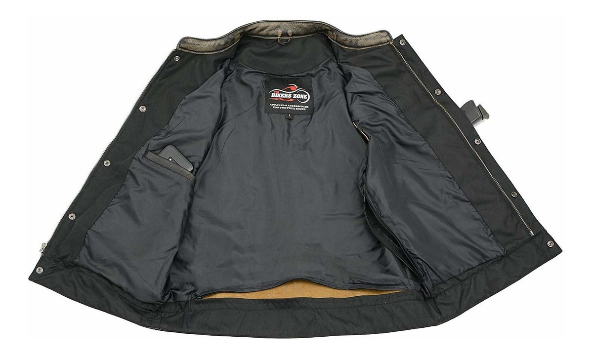 CALIDAD DE PIEL: Hecho de alta calidad Buffalo 1.2-1.3mm de cuero; CLUB chaleco estilo: Con todas las funciones añaden y el diseño de este chaleco tiene que ofrecerlo ganado su nombre de “Club de Estilo Chaleco”; PARCHE DE ACCESO: Características de una abertura con cremallera en el forro en la parte delantera y trasera para facilitar el acceso de parches de costura; NEW GUN POCKET: Lado izquierdo Outer-Seam oculta arma y de la munición de bolsillo que se puede acceder, mientras que el chaleco está comprimido hasta, la apertura está en la aleta izquierda en la costura donde el exterior y los materiales interiores se reúnen — otros focos: dos inferiores Mano bolsillos más cálidas dos bolsillos en el pecho Una w / Sunglass Holder de hendidura; OTRAS CARACTERÍSTICAS: Abrir diseño del collar w / oculta Snap cierre frontal — cremallera y Snap cierre frontal -Zipper oculta detrás de la tapa Tamaño: Grande | Color: Llanura Side