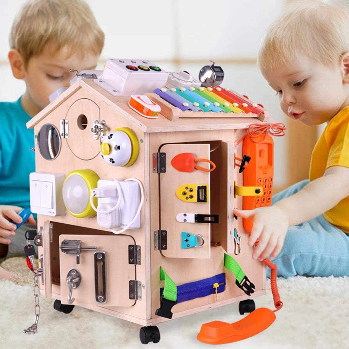 Juguete de lujo ocupado: configura a tu hijo para ser el próximo Einstein con BrainUpToys. La gran tabla sensorial de lujo promueve la emoción de juego y aprendizaje con un montón de proyectos. Deja que tus hijos aprendan más habilidades de vida fácilmente. 13.0 x 13.0 x 19.7 in, 15.0 lbs.; Tablero de actividades 40 en 1: nuestro juguete de aprendizaje cuenta con 40 centros de actividades, incluyendo spinner, luces de tráfico, cerrojo de metal, puerta, timbre, robot, ruedas, interruptor, salida, teléfono, volante, reloj, espejo, mini generador, xilófono, etc.; Requiere montaje: hecho de madera de tilo, no tóxico, pintura al agua, resistente y superficie lisa. La caja ocupada necesita montaje por adultos, todas las piezas y herramientas incluidas. Tres proyectos necesitan pilas, el paquete no incluye las pilas. Contiene piezas pequeñas, recomendado a partir de 3 años.; Método de Montessori: tabla ocupada inspirada en Montessori para promover el aprendizaje práctico, habilidades de autovestir, colores, matemáticas, formas, habilidades cognitivas y resolución de problemas y desarrollo motriz fino, también inspira su imaginación y creatividad.; Elección de regalo: maravilloso regalo para el cumpleaños de tus hijos, Navidad, día del niño. Promueve la interacción y la comunicación entre padres e hijos, lo que permite a los padres acompañar a sus hijos a enseñar y divertirse juntos. Todos nuestros productos estan en inglés SKU 13102113658