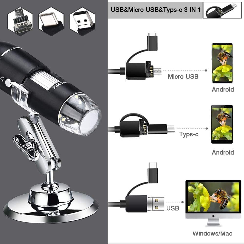 Fuerte compatibilidad 3 en 1 microscopio digital, equipo de apoyo, teléfono Android. Soporte Win7 / 8/10, XP y MAC. teléfono inteligente Android con la función OTG. (Nota: este microscopio no es adecuado para el sistema IOS) se puede empezar a explorar el mundo micro después de conectar el microscopio digital al dispositivo a través de USB; 1600X USB Microscopio Digital CÁMARA El microscopio digital 50x a 1600x le proporciona una maravillosa experiencia de grabar con claridad el micro mundo. Proporciona una excelente detalle y claridad, y permite la captura de imágenes o vídeos; Fácil de usar y fácil de llevar El microscopio de bolsillo es pequeño y ligero. Puede ser mantenido y operado por un lado. Se puede ajustar el foco a través del rodillo. El dispositivo está equipado con el soporte estable de metal y la base antideslizante. Se puede tomar para explorar al aire libre; Construido en 8 luces de relleno LED ajustable construido en 8 luces LED, se puede controlar fácilmente el brillo de la luz a través de la perilla de control de regulación de LED. La luz LED es suave y no deslumbrante. Se puede tratar fácilmente con varias escenas de acuerdo a sus necesidades, y se puede utilizar en el día y la noche; Amplia aplicación GAMA microscopios para ordenadores y dispositivos Android se puede utilizar para el aprendizaje y la educación, la investigación personal, insectos, monedas, inspección placa de circuito, la identificación de la joyería. microscopio digital USB 1600x adecuado para los niños, los estudiantes, ingenieros, inventores, colectores para magnificar las cosas micro como monedas, la piel, PCB, pelos, etc. Microscopio USB digital 50X a 1600X, construido en 8 ajustable Fill Led Luces Ampliación del endoscopio de la cámara, con el adaptador OTG y el soporte del metal Todos nuestros productos estan en inglés SKU 12062117048
