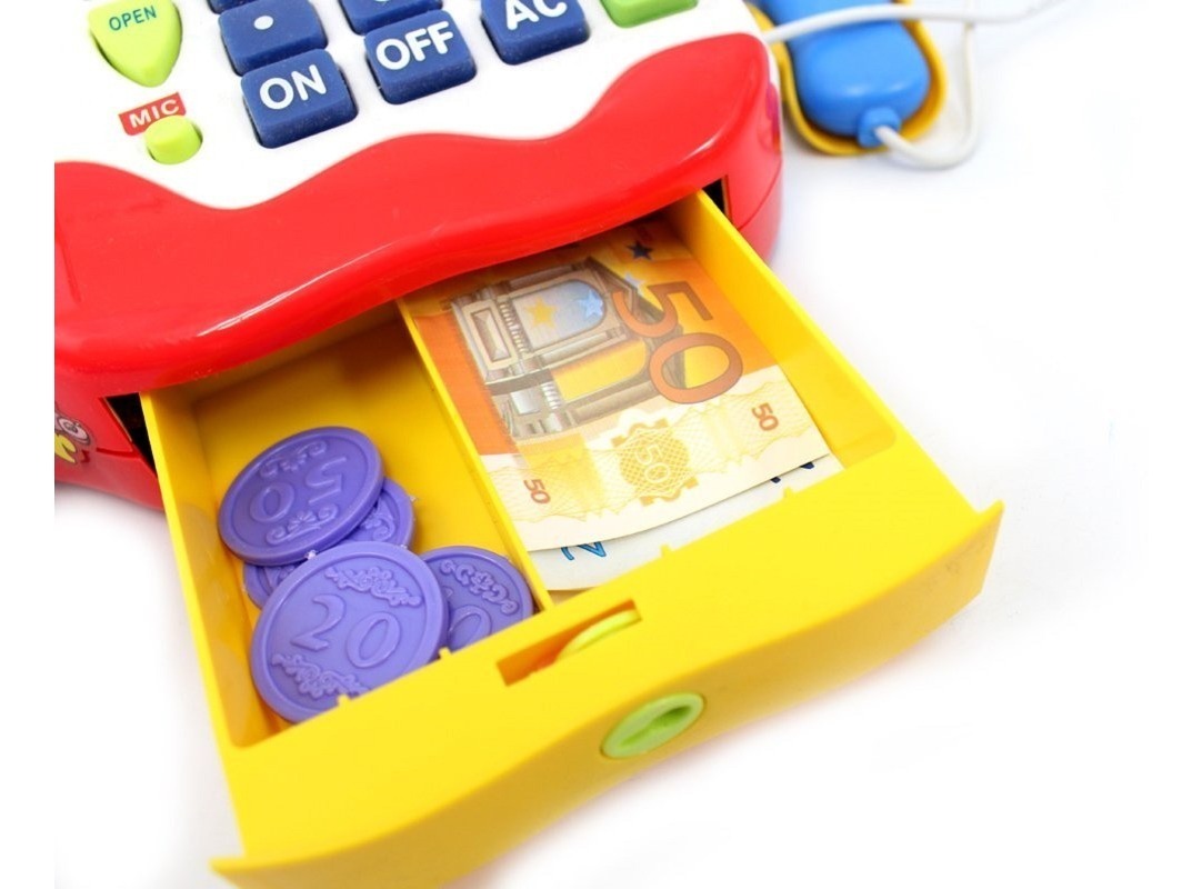 – Divertida caja registradora educativa con calculadora y cajón con cerradura.
