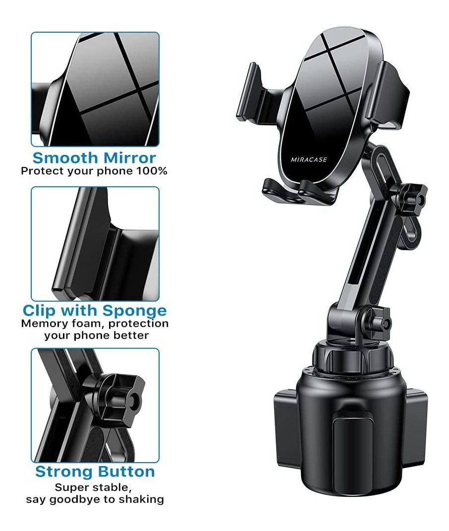Versión actualizada 2021 Miracase 2021-2 soporte de teléfono para automóvil actualizado el cuello largo, lo que lo hace mucho más flexible (con 2 pomos ajustables) y más largo (hasta 11 pulgadas), te permite ajustar un ángulo de visión perfecto y la altura del soporte para el teléfono. Garantiza una conducción segura.; Superestable y nunca se mueve: con el diseño de cuello largo duradero y resistente, el soporte para teléfono Miracase proporcionará una estabilidad extrema mientras conduces en las carreteras más irregulares. Los brazos de sujeción más profundos y los pies de sujeción suaves proporcionan una protección de 360 para tu teléfono; el soporte de estructura triangular mantendrá firmemente tu teléfono sin preocuparte por que tu teléfono se mueva cuando aceleras o haces un giro brusco.; Compatible con todos los teléfonos grandes y fundas gruesas: brazos de abrazadera ajustables superanchos y profundos que permiten que el soporte Miracase para teléfono se ajuste a todos los teléfonos celulares (4.0 a 7.0 pulgadas) y fundas gruesas (incluyendo Otterbox, fundas de batería), como compatible con iPhone 13/13 Pro/13 Pro Max/13 Mini/12/12 Pro Max/12 Pro Max/12 Mini /SE/11 Pro Max/11 Pro/11/XS MAX/XS/XR/X/8/8 Plus/7/7 Plus/Samsung Galaxy Note 20/S21/S21/S20/S20 Ultra/S10/Sony, LG, Google Pixel y todos los teléfonos móviles, dispositivos GPS.; Mejor protección para tu querido coche: sin ventosa ni clip de ventilación. No hay necesidad de pegar nada en el salpicadero o parabrisas, simplemente coloca el soporte del teléfono en el portavasos del coche y fíjalo para usar, no traerá manchas pegajosas inextraíbles a tu coche. Además, ya no te preocupes por romper las aspas de ventilación y tampoco dañará tu salpicadero, puedes utilizarlo de forma segura con tu querido coche.; Base ampliable mejorada La base ajustable mejorada se puede extender de 2.6 a 4.0 pulgadas para adaptarse a todos los portavasos de coche. Mientras tanto, con las almohadillas de silicona suaves antideslizantes y el material duradero y de alta calidad, el soporte para teléfono se bloqueará de forma segura en tu portavasos. Nunca se cae ni se rompe. Protege tus dispositivos de daños.; Garantía sin preocupaciones El soporte de teléfono Miracase soporta el servicio posventa de por vida, si tienes alguna pregunta, por favor ponte en contacto con nosotros directamente, y te daremos una solución satisfactoria Todos nuestros productos estan en inglés SKU 91221079879