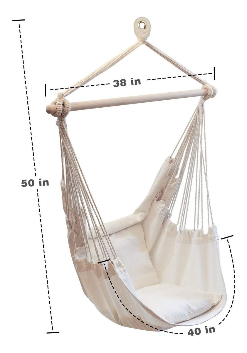 Hardware incluido MI IDEA silla colgante incluye todo el kit colgante con una instrucción. Sólo hacer un agujero en el techo, insertar los tornillos, y elegir su estilo con cadena de acero, mosquetón, o S gancho. No es necesario ejecutar para una tienda de hardware, sino disfrutar de relajantes tiempo inmediatamente .; silla de la hamaca RESISTENTES MIS IDEASestá equipado con 38 pulgadas de largo fuerte barra de madera. Las medidas de asiento de la silla de oscilación es de 40 x 50 pulgadas. Tiene una fuerte capacidad para soportar su peso y puede albergar hasta 300 lb. tamaño perfecto para la mayoría de las personas .; Relax y RECHARGED mecedora MIS IDEAS le permite sentarse como un rey o una reina. Es muy cómodo y ofrece un ambiente acogedor y le trae un modo relajado, zen inmediatamente. Ideal para la lectura y beber para aliviar el estrés de la vida cotidiana .; Decoración Crear casa de sus sueños con este mi IDEAS silla de la hamaca columpio y almohadas a juego. Perfecto para su uso en interiores y al aire libre. El color beige es un atemporal y práctica del color que combina con cualquier estilo de decoración moderna .; FELICIDAD GARANTÍA MIS IDEAS # 1 prioridad es su felicidad. Si no está satisfecho con nuestra silla colgante por cualquier razón, vamos a resolverlo. Reembolso de la misma. El envío de una nueva silla de la hamaca. no se hacen preguntas. Sólo llegar a nosotros en cualquier momento. Estamos aquí para ti. Relax … Es un momento para estar en paz en la silla colgante MIS IDEAS