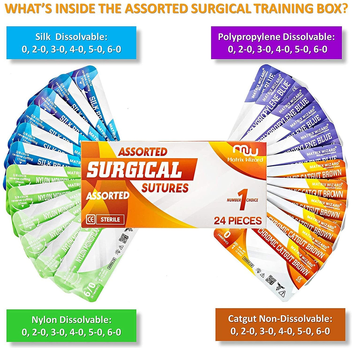 NUEVO PRODUCTO: Vamos a presentar la última incorporación a la línea de productos de aprendizaje Asistente Matrix. Estamos introduciendo nuestro surtido paquete de sutura 24, que se compone de diferentes tamaños 0, 2/0, 3/0, 4/0, 5/0 y 6/0: no absorbible seda trenzada negro, espalda nylon monofilamento, monofilamento azul polipropileno, y catgut crómico absorbible. Éste de un paquete de sutura con suturas tipo maquillaje se siente bien informado de cada tipo de sutura y el uso .; Estéril: Todas las suturas se fijan a una de acero inoxidable aguja de corte inverso ultra-agudo. Por separado envuelto y completamente sellado, con caducidad prolongada. Esto es ideal para la práctica de primeros auxilios, la práctica de la supervivencia táctica, demostración de supervivencia acampar al aire libre, campo o formación hospitalaria clínica, y experimentos de laboratorio de la escuela .; ALTO ESTÁNDAR: Este combo práctica de sutura mixta pasó el alto nivel de la junta internacional de productos de control de calidad. Es un dispositivo perfecto que los alumnos clínicos, médicos residentes, estudiantes de enfermería, veterinarios en ejercicio, y otros profesionales de la medicina de formación aliada les encantará. También es aplicable para los aficionados, taxidermistas, individuos de bricolaje, productos de la escuela, el arte y la artesanía, la pesca, y mucho más !; BENEFICIOSO: La colección de sutura está diseñado para permitir a los individuos para establecer la tan necesaria confianza y habilidades para dominar el arte de la sutura. Este es un accesorio imprescindible para los futuros médicos como los médicos en formación, enfermeras, asistentes médicos, dentistas, técnicos de emergencias médicas, y el kit de entrenamiento de emergencia de primeros auxilios veterinarios pinza hemostática. Uso ganarán confianza en la costura y las habilidades médicas de primera clase .; CONFIANZA El producto es utilizado por las instituciones de formación de líderes en el país e incluso compró por las escuelas médicas de prestigio en diferentes partes del mundo. Esta configuración única que nos hace la elección superior de aspirantes a proveedores de servicios médicos. Más en particular, nuestros clientes son más valiosos que nuestras ventas. Si no está satisfecho con su kit de sutura por cualquier razón, por favor devolverlo para un reembolso completo de su dinero. Esa es la confianza que tenemos. Ser el mejor entre el resto. Haga clic en Añadir al Carro AHORA! Todos nuestros productos estan en inglés SKU 4032130662