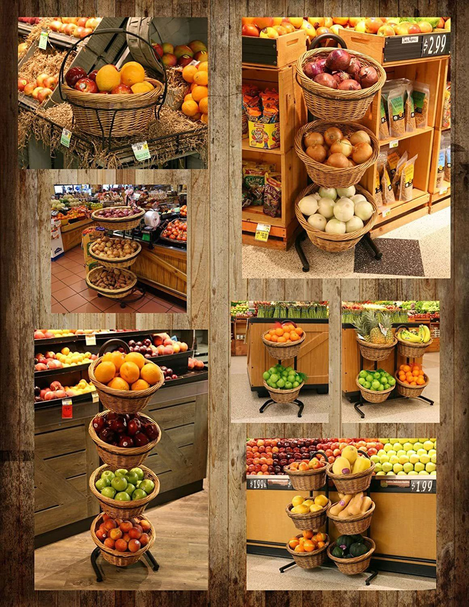 High quality black matte tube steel frame; (4) four round willow baskets; a sign frame; and (4) sign clips included in box; This display is 15w x 56h x 16d; each basket is 15w x 7h x 15d; Willow is proven to be more durable and stronger than other basket materials on the market; The angled presentation is visually appealing as a décor item as well as perfect for cross merchandising as each basket is easily accessible; Sign frame and sign clips are provided for easy labeling and pricing Our Mobile Merchandisers K1430-4B-MB 4-tier 4 round Willow basket display with Sign frame and Sign clips has a black matte tube steel frame. It stands 56 inches high by 15 inches across. It includes Willow baskets, Sign frame and Sign clips. Basket dimensions: 15 inch W x 7 inch H x 15 inch D overall dimensions: 15 inch W x 56 inch H x 16 inch D K1430-4B-MB #: k1430-4b. Todos nuestros productos estan en inglés SKU 91221058336
