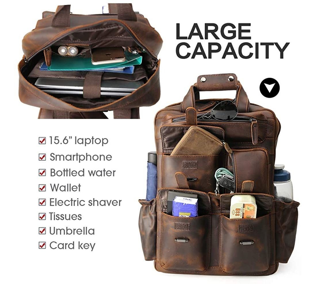 Forro de piel y poliéster; Importado; Revestimiento de Polyester; Cierre de cremallera; Caída de hombro de 14; Mochila de piel mejorada: basado en los comentarios del cliente, hemos actualizado la mochila marrón a cremalleras YKK resistentes, que pueden soportar 1000 veces la prueba de fuerza de tracción. La parte posterior de la bolsa adopta un acolchado de malla transpirable y ergonómico para aumentar la experiencia de carga cómoda y evitar teñir la ropa. Se añade un cinturón de equipaje trasero para que puedas poner la mochila en la maleta, para reducir tu fatiga y hacer tu viaje más fácil.; Múltiples bolsillos y gran almacenamiento: bolsillos frontales multifuncionales con estilo de moda, amplios organizadores para pequeñas cosas esenciales como llaves, bolígrafos, cigarrillos. El compartimento principal se adapta a un portátil de hasta 15.6 pulgadas, la funda interior acolchada se adapta a un portátil de 14 pulgadas. Los bolsillos laterales pueden almacenar un paraguas o una botella de agua. Estructura: 5 bolsillos frontales, 2 bolsillos laterales, 1 bolsillo interior con cremallera, 2 trabillas para bolígrafos, 2 bolsillos interiores, 1 compartimento principal.; Material de alta calidad bien hecho: la mochila de piel para portátil está hecha a mano de piel auténtica de caballo loco de 0.079 in de grosor, no voluminosa pero resistente. Forro duradero y material resistente que proporciona una larga vida útil. La piel parece un aspecto retro al principio, tiende a ser más brillante y se ve mejor con el tiempo de servicio. Remaches metálicos reforzados para aumentar la capacidad de carga de la mochila de cuero. La longitud de la correa de hombro ajustable puede adaptarse a tu altura libremente.; Estilo casual versátil: la mochila es perfecta para el trabajo, oficina, viajes, viajes de negocios, compras, fiestas, senderismo, al aire libre, montañismo, camping y todas las ocasiones. Se puede utilizar como una mochila latop, mochila escolar universitaria, bolsa de libros, mochila de viaje, mochila casual y así sucesivamente.; Compra con confianza: un año de compromiso de calidad desde que compras la mochila de cuero para hombres, si tienes cualquier pregunta o preocupación, por favor ponte en contacto con nosotros, te ayudaremos a resolver cualquier problema. Dimensiones de la mochila: aproximadamente 12.6 x 4.7 x 16.9 in. Peso: 3.5 lbs. Todos nuestros productos estan en inglés SKU 13102127610