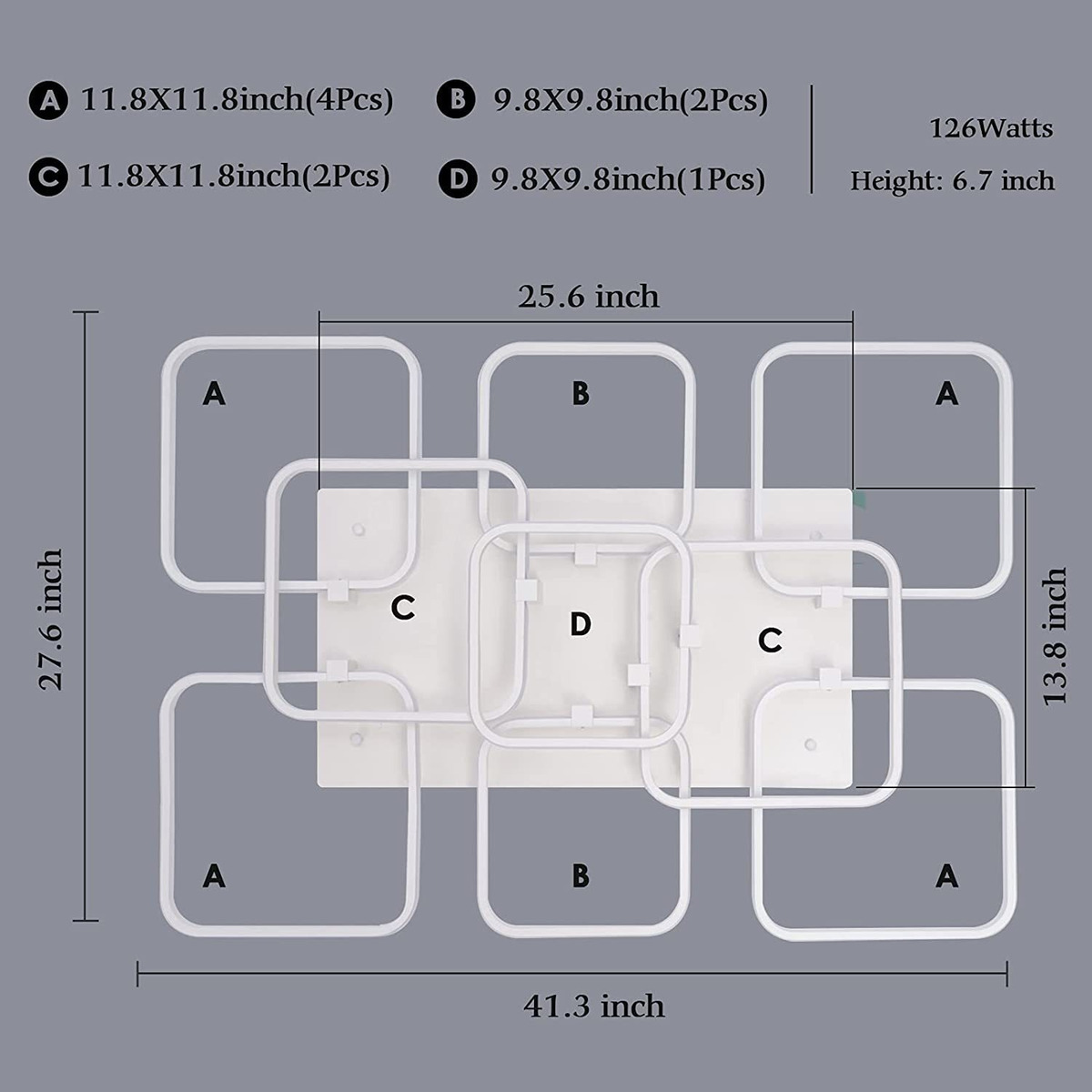 Regulación continua: la moderna lámpara de techo emite seleccionables, se puede ajustar de acuerdo a tus necesidades a través del mando a distancia: blanco suave, blanco brillante o luz diurna y luz cálida 3000 K-6500 K se puede seleccionar a voluntad. Así que puedes hacer tus luces como quieras.; Especificaciones: Dimensiones del producto acabado: 41.3 pulgadas de largo x 27.6 pulgadas de ancho x 6.7 pulgadas de alto. Las dimensiones de la base montada en el techo son: 25.6 pulgadas de largo x 13.8 pulgadas de ancho x 2 pulgadas de alto. No giratoria. Potencia: 126 vatios. T, Voltaje: 1 10 V. Área adecuada: alrededor de 20 40 ; Fácil de instalar: incluye todos los accesorios de montaje para una instalación rápida y fácil. El diseño ligero añadirá un aspecto moderno, mientras que complementará la decoración de tu habitación.; Amplia aplicación: perfecto para áreas interiores generales que incluyen comedor, sala de estar, cocina, pasillo, cafetería, sótano, bar, club, restaurante, oficina, biblioteca, dormitorio y sala de lectura. Puedes elegir dónde se instala de acuerdo a tus necesidades reales.; Esta lámpara de techo para dormitorio/sala de estar/comedor/cocina/lámpara de techo 30 días de cambio y devolución gratis y 5 años de garantía (puede enviar piezas defectuosas o reembolso parcial). Tenemos nuestra propia fábrica y equipo de ingenieros profesionales. Siempre nos adherimos al principio del cliente primero, si tienes alguna pregunta sobre productos o servicios, no dudes en ponerte en contacto con nosotros, te daremos la solución más satisfactoria. Todos nuestros productos estan en inglés SKU 91221008338