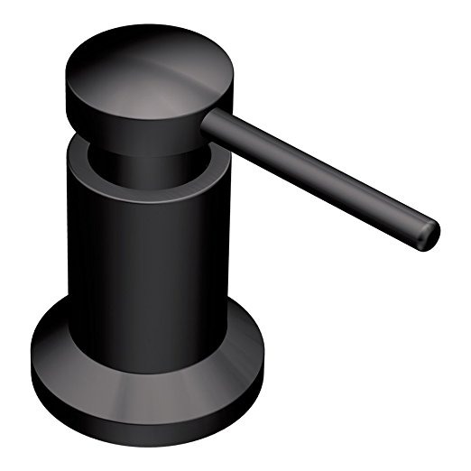 Moderno integrado en el fregadero dispensador de jabón y loción para la cocina; la parte superior desmontable para facilitar recargas; Incluye 18 onzas botella rellenable; Acabado negro mate complementa una variedad de grifos; Respaldado por la garantía limitada de por vida de Moen Descripción del producto