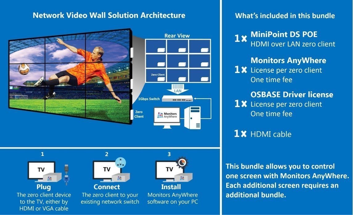 Monitores en cualquier lugar – Mostrar su contenido en varios monitores utilizando un único PC! HDMI a través de LAN, Extensor de vídeo, Delgado Global en mini-puntos de señalización digital PoE Monitores en cualquier lugar es un cambiador de juego para la señalización digital Conectividad – Di no a reproductores multimedia y extensores de vídeo!