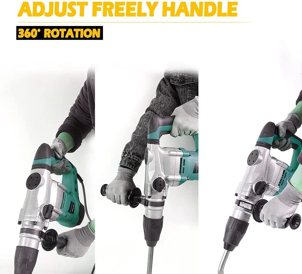 Interfaz SDS Max de 0.7 in. Compatible con herramientas compatibles con SDS-Max, extracción de yeso y demolición ligera en mampostería, para romper y aflojar la tierra, el pavimento y el betún; 3 modos diferentes: tres modos de funcionamiento incluye solo rotación, martilleo con rotación y martilleo solamente para múltiples aplicaciones. Tres funciones diferentes de taladro, martillo y función de taladro se adaptan a una variedad de escenarios de trabajo que son fáciles de cambiar; El paquete incluye: 2 cinceles Sds Max (punto/plano), 1 mango auxiliar, 1 tapa antipolvo, 1 llave para tapa de aceite, 1 bote de grasa; Mango de ajuste de 360 grados: el control de vibración mejora la sensación de control. El diseño de entrada de aire a prueba de polvo de doble capa extiende la vida útil, el mango de goma y ajuste de 360 grados proporciona una sensación cómoda de usuario.; Control de velocidad variado: cuenta con 5 niveles de ajustes de velocidad. Velocidad máxima de descarga giratoria de hasta 650 r/min, frecuencia de impacto de hasta 4200 bpm. Sistema de control de dial de velocidad fácil de usar.; Nota: inserta el cincel hasta que se bloquee. Todos nuestros productos estan en inglés SKU 91221001508