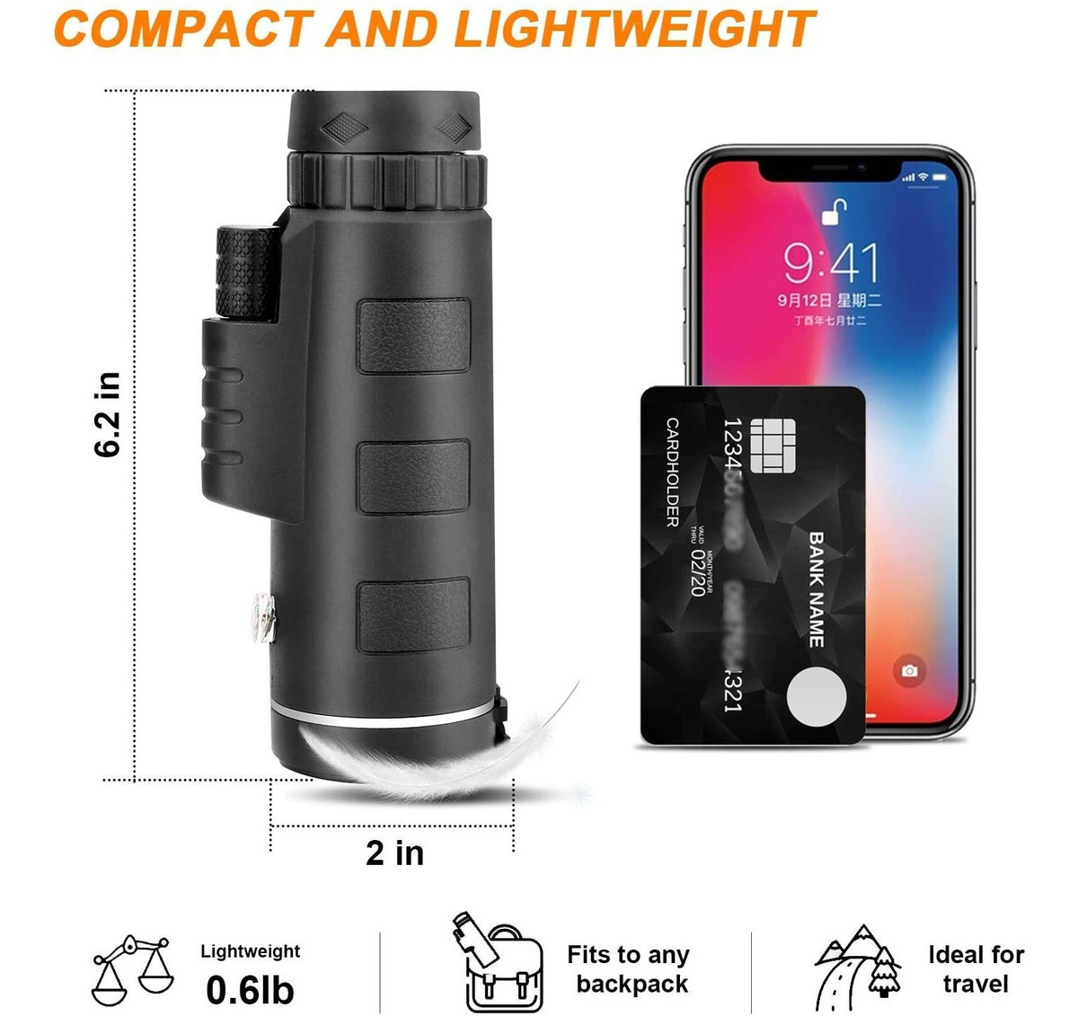 Telescopio monocular 40X60 párrafo Equipado con prisma BAK-4 y lente recubierta verde FMC (Totalmente MULTICAPA). El prisma BAK-4 (alcalde transmitancia de luz Que El prisma BAK-7) permite Más transmisión de luz y Gana Más brillo. El Tipo Más Popular de monocular Es Como La Mitad de la ONU par de prismáticos. Especialmente Diseñado PARA CUALQUIER entusiasta del aire libre, Este monocular es perfecto para senderismo, caza, escalada, Observación de aves, vida silvestre y paisajes y otras actividades al aire libre. Cabe En un bolsillo, por Lo Que Es Fácil de Transportar Y Es Fácil de USAR. Si Quieres ver algo Que esta Lejos, Pero No Quieres Llevar prismáticos, monocular ONU it Dispositivo Gran ONU. El adaptador de teléfono inteligente incluido le permite Capturar y grabar belleza un su Alrededor. Para Que Puedas compartir Diversión Con Tus Familias y Amigos. Descripción 1. Cuerpo de goma de Protección del Medio Ambiente, Duradero, Asi Como agradable y Sensación Cómoda de la Mano. 2. La lente objetivo m y el ocular ESTÁN Equipados con cubierta contra el polvo para Proteger las lentes. 3. El trípode Se Puede Como utilizar Con Este monocular, por Lo Que es mas estable para OBSERVAR pájaros u Otras Cosas en el Exterior. 4. El prisma monocular es mas conveniente de USAR párrafo Conectar tu Teléfono Celular Con El Soporte del Teléfono. Diseño de materiales Duradero Nuestro diseño es perfecto para la USO, al aire libre, ya Que esta FABRICADO con plástico de Ingeniería de Alta Durabilidad Que Lo protegerá de any Pequeña gota. El Acabado de goma es ideales para Resistencia a los golpes y le Dara ONU agarre firme y cómodo. Todos nuestros productos estan en inglés SKU 4022167061
