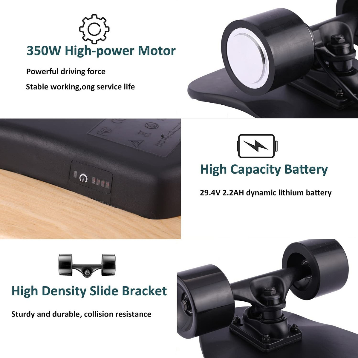 El motor del cubo de 350W es potente, que puede acelerar el longboard eléctrico a 12MPH, y el ruido es muy pequeño cuando trabaja. Es un motor de no resistencia, incluso si el monopatín está fuera de potencia, puede ser montado como un monopatín normal. El longboard eléctrico tiene 29.4V 2000 mAh batería de litio, que se puede cargar completamente en sólo dos horas, y el rango de conducción es de hasta 8millas. El monopatín eléctrico viene con un mando a distancia inalámbrico de 2,4 GHz. Tiene tres modos de velocidad, bajo: 6.2 mi / h, medio: 12.4 mi / h, Max. : 18,6 mi / h. La distancia remota efectiva es de 45.9 ft, y se tarda aproximadamente dos horas en cargarse. El longboard eléctrico está hecho de arce de 8 capas de buena calidad, que no es fácil de romper. Puede soportar un peso de hasta 176.4 lbs. El monopatín eléctrico está equipado con neumáticos de primera calidad. Tiene un agarre fuerte y no es fácil de deslizar, dando a los usuarios una buena experiencia de conducción.