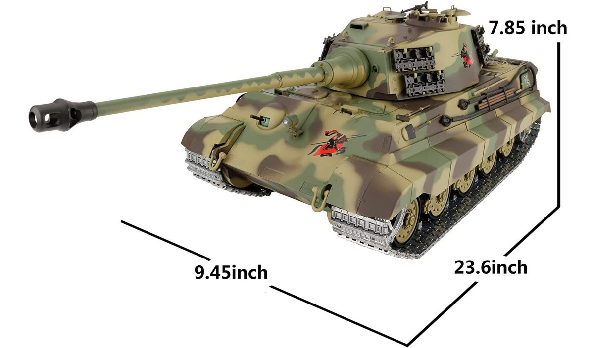 Caja de cambios de acero mejorada. Más resistente al desgaste, vida útil multiplicada.; Rueda dentada de metal y rueda dentada de metal y rueda de ralentí de metal.; Torreta giratoria de 360 grados (izquierda/derecha), anillos deslizantes eléctricos giratorios de 360 grados hechos a mano e instalados en tanques. (No es una configuración estándar de fábrica).; Batería NiMH recargable de alta potencia de 3800 mAh. (No es una configuración estándar de fábrica).; Caja de sonido modificada. Hecho a mano e instalado en tanques. Sonidos más realistas de motor simulativo y sonido de cañón. (No es una configuración estándar de fábrica). ——Características: