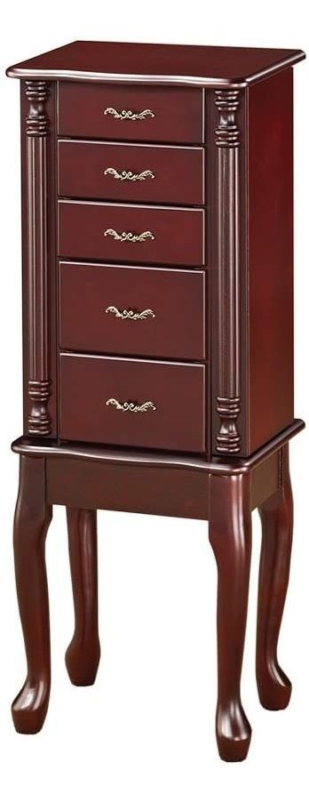 El juego incluye: Un (1) joyería de armario; Materiales: Rubberwood, de chapa de madera de ingeniería, tableros de partículas y MDF; Acabado de color: Merlot; Montaje requerido: Sí; Límite de peso: 22 lbs; Hardware Acabado: Latón; 4 cajones, puertas 2 swing-out y altos ascensor con espejo; estructura de cajón: la construcción del cajón Tornillo Completar el aspecto elegante de un esquema de diseño tradicional. Perfecta para organizar y almacenar las gemas más preciadas, este armario de la joyería añade un toque final. Un clásico ofertas motivos Queen Anne lo mejor en belleza tradicional, mostrando curvas sensuales y acentos detallada. Disfrutar de un acabado en rojo vino que irradia toda una habitación. joyas escondite detrás de las puertas y cajones forrados de fieltro-y disfrutan de la ventaja de un espejo flip-top. Todos nuestros productos estan en inglés SKU 6102019969