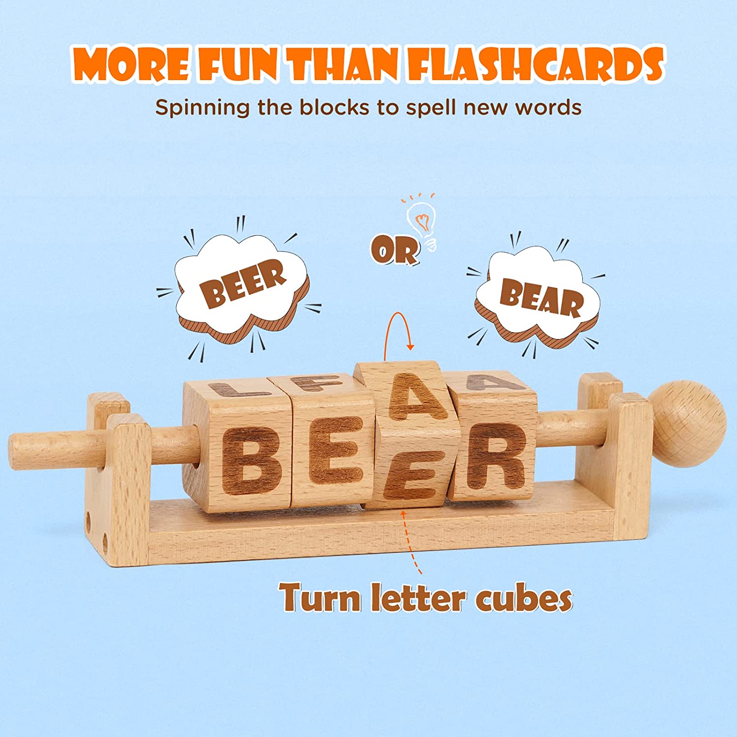 JUGUETES MONTESSORI DEL ALFABETO DE MADERA: este juego de bloques de aprendizaje de palabras visuales viene con 16 cubos de letras de cuatro lados de madera, 50 tarjetas flash de palabras visuales de imágenes de dos lados, 1 portatarjetas, 1 barra portabloques y 1 bandeja para bloques. Las palabras de la tarjeta son adecuadas para niños pequeños, perfectas para niños en edad preescolar de 1 2 3 4 5 6 7 8 años para aprender y hacer juegos de ortografía, combinación y conteo.