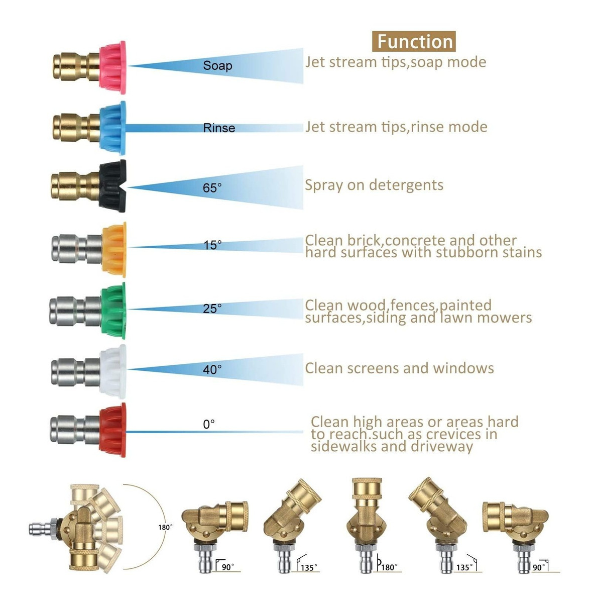 Para la varilla de lavado a presión: la boquilla turbo giratoria de lavado a presión tiene un orificio de 4,0, 4,0 GPM con un conector rápido de 0.2 in para arandelas de presión de hasta 4000 PSI, que puede adaptarse a la mayoría de varillas de lavadoras de alta presión; el rango de rotación del acoplador pivotante es de 180 grados y puede girar 45 grados, 90 grados, 120 grados en una dirección.; Material de calidad: hecho de núcleo de cerámica y exterior de goma y latón, la boquilla turbo de conector rápido es antioxidante y antienvejecimiento; las puntas de la boquilla de pulverización están hechas de acero inoxidable, que se puede aplicar durante mucho tiempo; el acoplador pivotante está hecho de latón y acero inoxidable.; 7 patrones de pulverización: viene con 7 boquillas de pulverización en diferentes patrones de pulverización, el rojo es de 0 grados, el amarillo es de 15 grados, el verde es de 25 grados, el blanco es de 40 grados, el negro es de 65 grados, el rosa es modo de jabón, y el azul es modo de enjuague.; Amplias aplicaciones: conector rápido de 4,0 GPM turbo boquilla es adecuado para hormigón, bloques, ladrillos, piedras de pavimento y la mayoría de las superficies exteriores, que puede lavar el coche, el borde del coche, la casa y el drenaje, agua la flor, prácticos accesorios para el limpiador de presión de agua fría; el acoplador pivotante es de 1/4 pulgadas de desconexión rápida, se adapta a la mayoría de marcas de varillas y boquillas de lavado a presión, hasta 4500 PSI; Lo que obtendrás: el paquete incluye 1 boquilla giratoria de 4000 PSI, 1 acoplador pivotante de 4500 PSI para boquilla de lavado a presión con rotación de 240 grados, y 7 boquillas de pulverización, una cómoda combinación puede satisfacer tus necesidades. Kit de accesorios de lavadora a presión, 4.0 boquilla turbo giratoria 4000 psi 4.0 gpm, acoplador de conexión rápida de 1/4 pulgadas, rotación de 180 grados, 4500 psi con 7 boquillas de pulverización