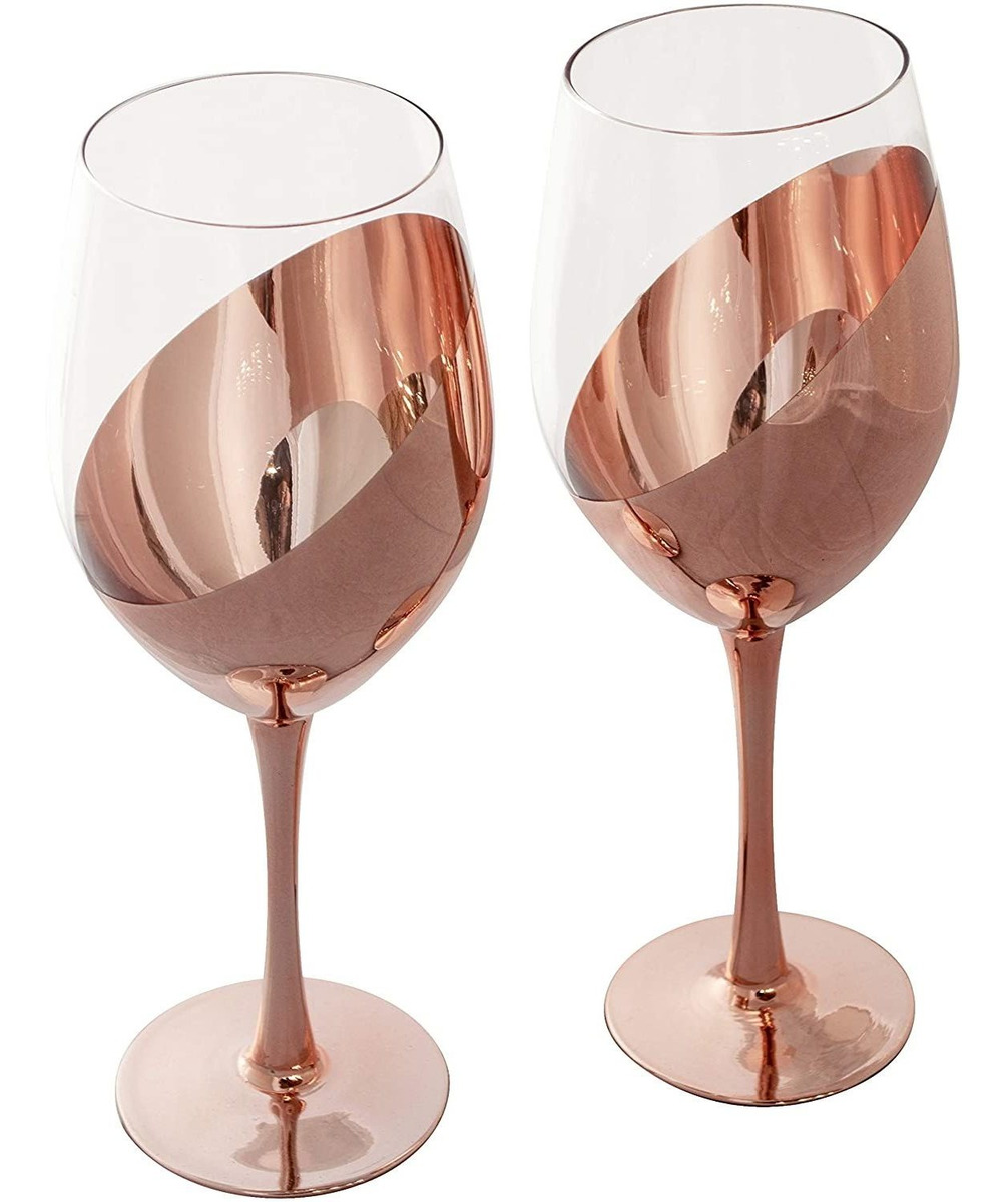 Juego de 4 copas de vino de tallo largo con acabado de cobre, ideales para fiestas y ocasiones especiales; El cobre permite que los vinos blancos permanezcan fríos y los vinos tintos mantengan una temperatura ambiente perfecta; Perfecto para fiestas, bodas, cenas románticas y reuniones informales; Cada vaso tiene capacidad para hasta 14 onzas Se recomienda lavar a mano; no apto para lavavajillas; Dimensiones aproximadas: 9.4 in de alto x 3.5 in de diámetro Todos nuestros productos estan en inglés SKU 91221045934