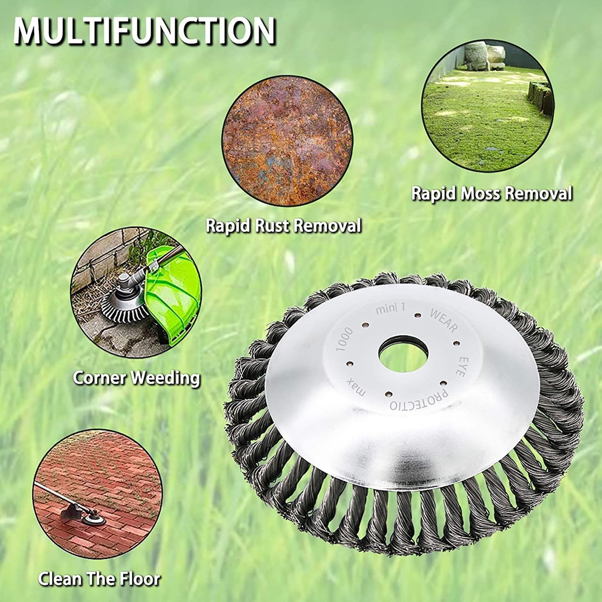TamañoEl diámetro de la cabeza de la cortadora es de 8.0 in, el diámetro del agujero central es de aproximadamente 1.000 in.; Alta calidad: este cabezal de cortacésped está hecho de alambre de acero de alta calidad, afilado y eficiente, estable y duradero. El alambre de acero no se cae fácilmente y es largo tiempo de uso.; Fácil de instalar y usarFácil de instalar y fácil de usar. Simplemente monta este cepillo en el recortador y empieza como de costumbre. Incluye kit adaptador.; Aplicación: este cabezal de recortadora es ampliamente aplicable a césped, jardines, parques, aceras, caminos de piedra con césped, etc. Adecuado para cortar hierba gruesa y malas hierbas, eliminación de óxido, desbarbado, etc. Cuando se golpea con piedras y grumos, sigue funcionando.; Nota: Por favor, usa ropa protectora y gafas cuando trabajes con el cepillo de malas hierbas. Tamaño:8 pulgadas