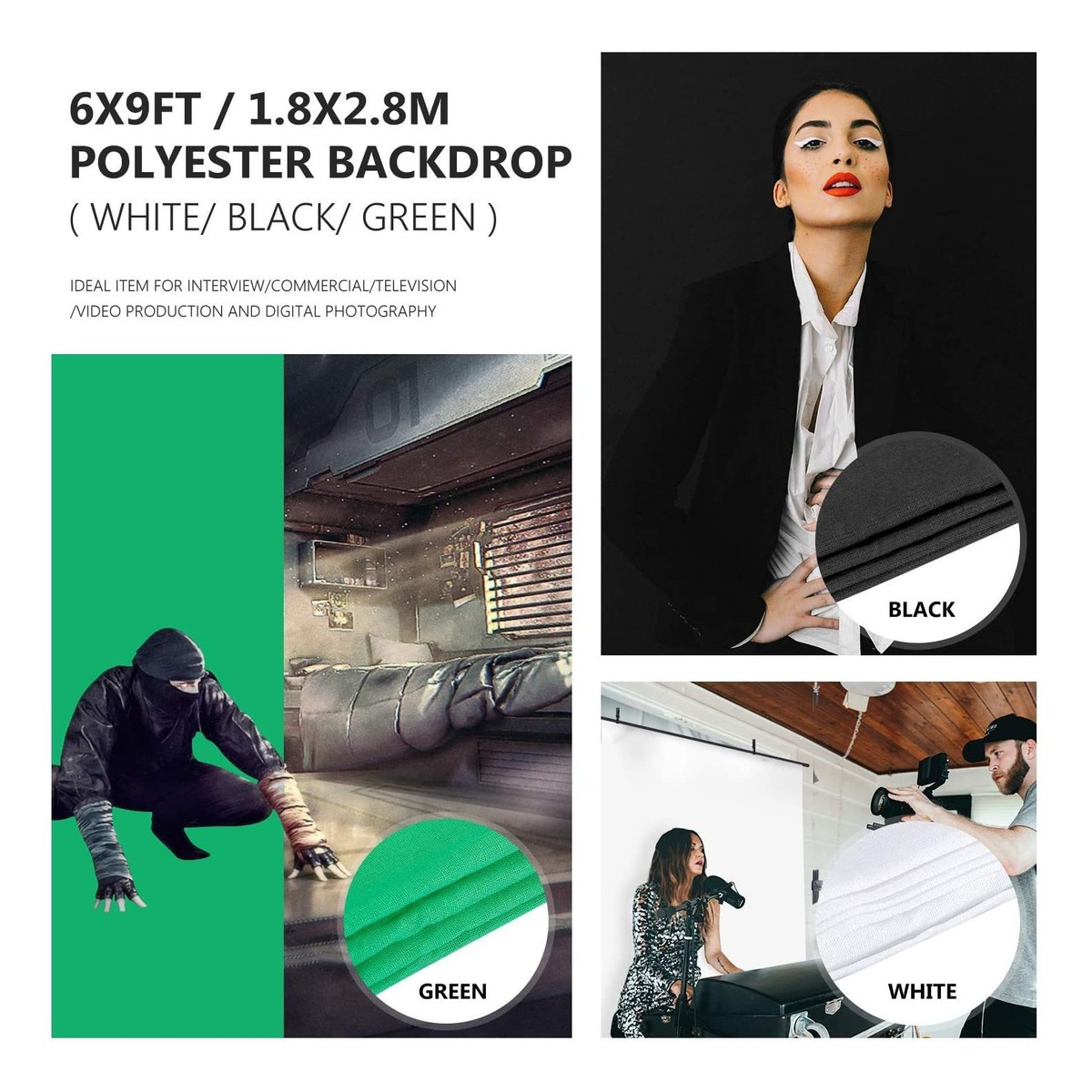 (3) telón de fondo de tela de 5,9 x 9,2 pies (negro, blanco y verde) con (6) abrazaderas de telón de fondo