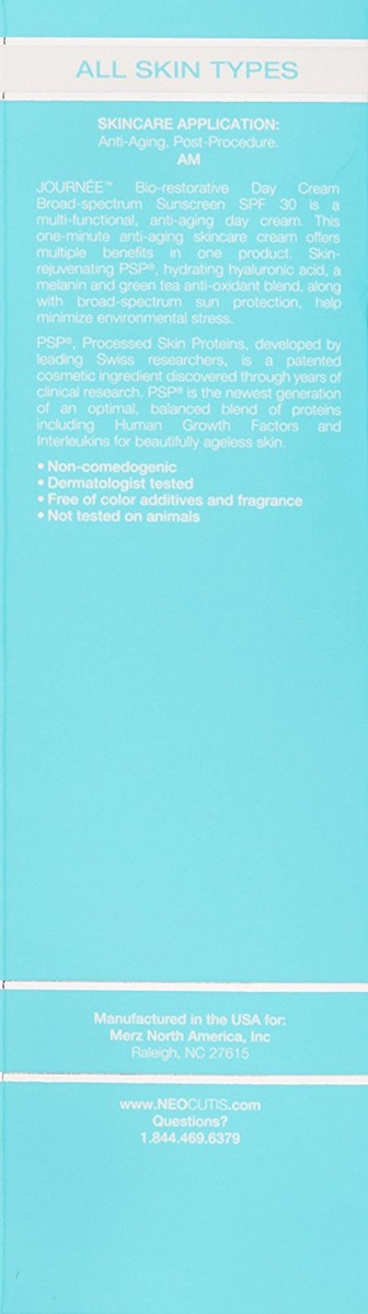 JOURNÉE es una crema multifuncional que ayuda a restaurar la humedad y proporciona amplio espectro UVA / UVB SPF 30 de protección solar. Descubierto a través de años de investigación en la cicatrización de heridas, PSP, Procesado célula de la piel proteínas, es un ingrediente cosmético patentado desarrollado por los principales científicos suizos y disponible exclusivamente en productos de cuidado de la piel Neocutis. PSP es una mezcla óptima de alimentar proteínas y polipéptidos. PSP aprovecha el poder de factores de crecimiento humano, interleucinas y otras citocinas, para ayudar a entregar la revitalización de la piel del estado de la técnica. Una mezcla de PSP, ácido hialurónico, potente antioxidantes y de amplio espectro SPF 30 ayudan a rejuvenecer, hidratar, proteger, nutrir y revitalizar la apariencia de la piel; todo en una sola aplicación! El uso diario de JOURNÉE proporciona las siguientes ventajas: ayuda a suavizar la apariencia de líneas finas y arrugas. Proporciona hidratación para la piel radiante y luminosa. Reduce el riesgo de estrés ambientales diarias con una mezcla potente antioxidante del extracto de té verde rico en polifenoles, se estabilizaron las vitaminas C y E, además de melanina. Protege contra de foto-envejecimiento o foto-daño con filtro solar UVA / UVB de amplio espectro. Disminuir el riesgo de cáncer de piel y envejecimiento prematuro de la piel causado por el sol si se usa según las indicaciones con otras medidas de protección solar. fórmula de rápida absorción, no graso se mezcla sin problemas en la piel. Todos los tipos de piel: no comedogénico, dermatólogo probado, libre de aditivos colorantes y fragancias, no probados en animales. Los resultados individuales pueden variar.