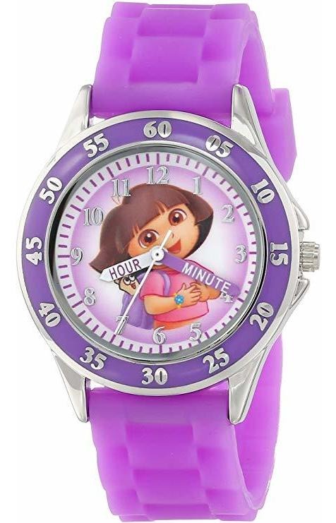 reloj maestro de tiempo dora que es perfecto para los niños pequeños que están aprendiendo a decir la hora Púrpura y reloj de tiempo de enseñanza en tono plateado con Dora el motivo Explorer y fácil de lectura de línea con las manos marcadas; caja de metal 33 mm con la ventana de línea de vidrio; Movimiento de cuarzo con pantalla analógica; banda de goma con cierre de hebilla; No es resistente al agua Todos nuestros productos estan en inglés SKU 5022000498