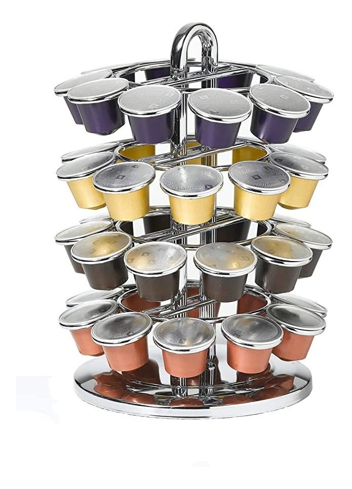Tiene capacidad para 40 cápsulas de café Nespresso; base de Lazy Susan gira 360 grados; acabado cromado elegante, este no es un accesorio de almacenamiento “Keurig”. Este artículo es específico para almacenar Nespresso cápsulas Espresso. Esto no está destinado a almacenar el Nespresso cápsulas Vertuoline .; La construcción de calidad construidos para durar; Dimensiones – altura de 9-1 / 2 pulgadas por el diámetro de 6-3 / 4 pulgadas; No es para uso con Nespresso Vertuoline vainas Todos nuestros productos estan en inglés SKU 21052039495